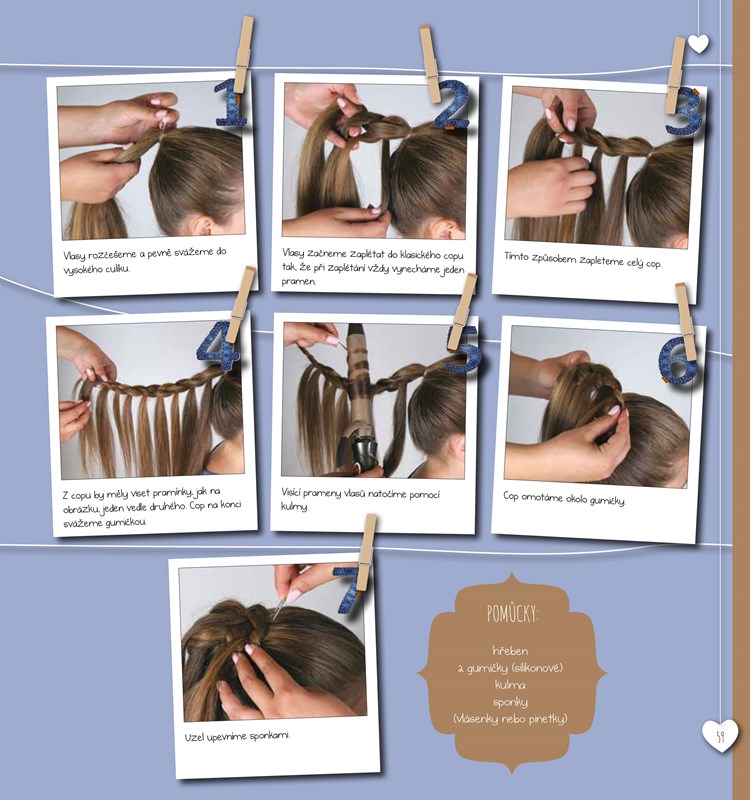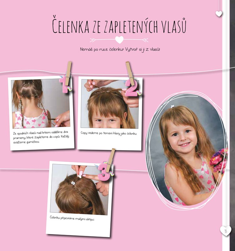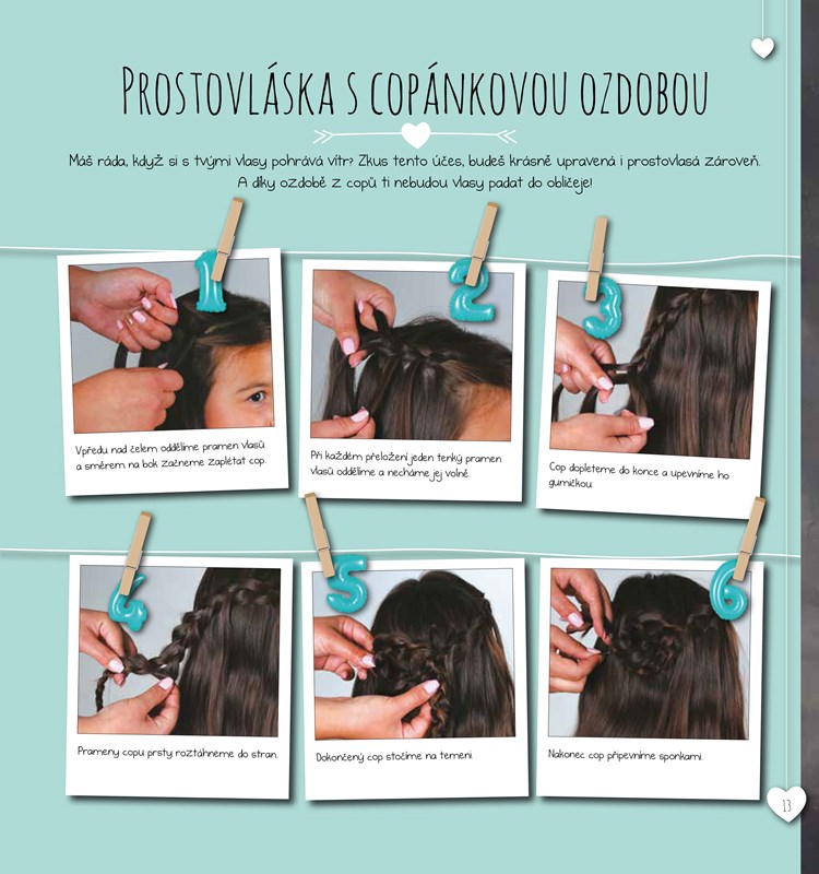 Jsi ráda za elegantní dámu, nebo roztomilou školačku? Publikace ti poradí, jak z jednoduchých copů a drdolů vykouzlíš pomocí doplňků (květiny, čelenka, šátek, ...) fantastické účesy třeba na velkolepou oslavu nebo na zábavnou procházku s kamarády.