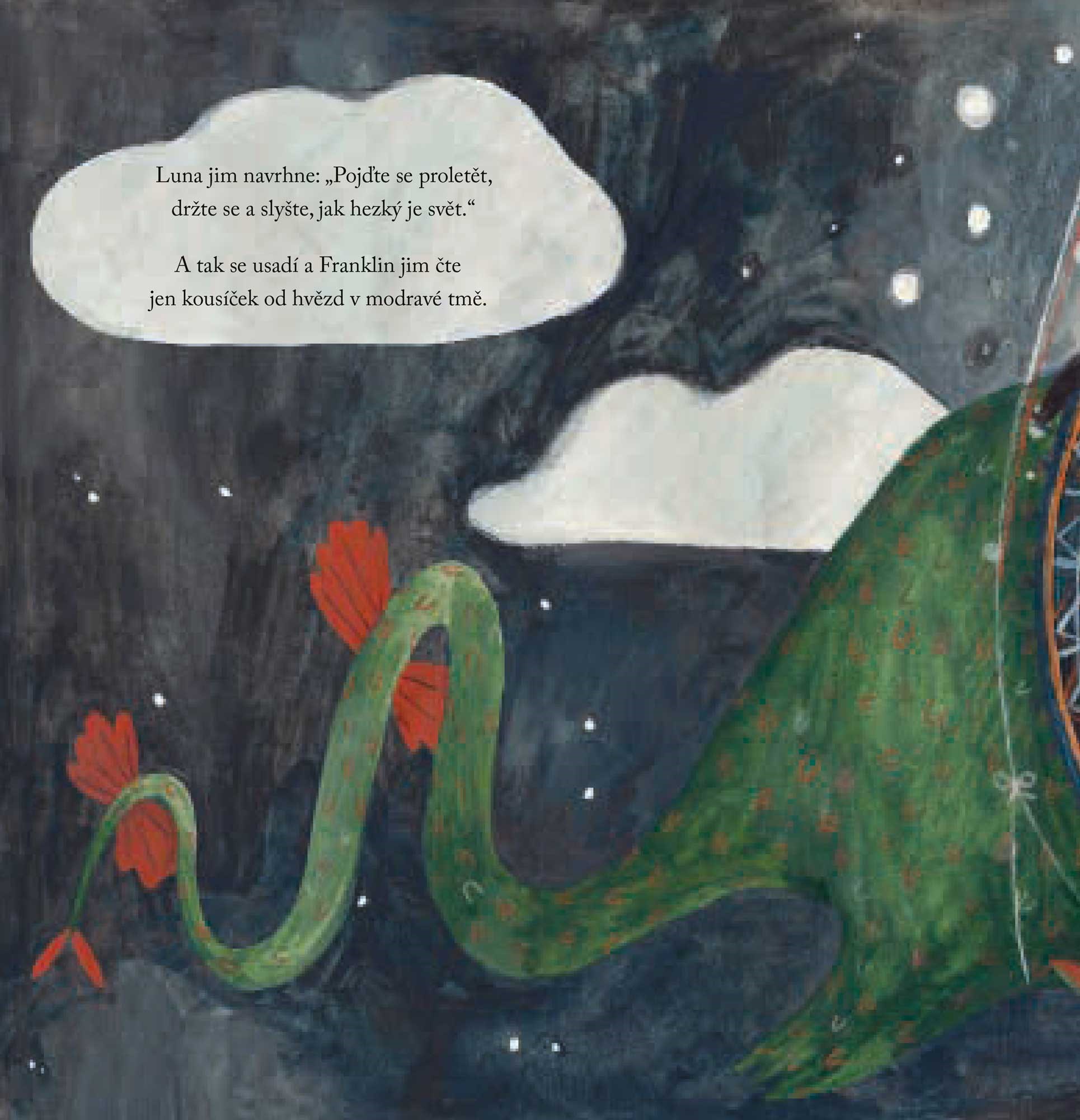 Naštěstí najde spřízněnou duši v Luně, holčičce, která miluje knihy stejně jako on. Společně vymyslí, že si otevřou knihovnu. A ne ledajakou, ale létající a přímo na Franklinových zádech!