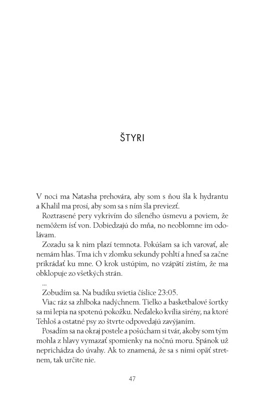 Síce, musím priznať, čítať túto knihu bolo občas dosť veľký problém, pretože som 200 strán čítala 2 dni! Dej sa neskutočne vliekol a autorka prakticky neponúkala nič nové. I keď ! Počas tých 200 strán vám predostrela rôzne životné osudy (nielen Starr a Khalila), život v gangoch, ako to chodí, aká je nevraživosť bielych voči čiernym, ale zároveň aj naopak. Poukázala na silu lásky zo strany rodiny, či už rodičovskú, alebo aj súrodeneckú. Starrinu rodinu som obdivovala, pretože napriek všetkým zlým udalostiam, čo sa stali, tak stále držali spolu a ľúbili sa, boli si oporou.