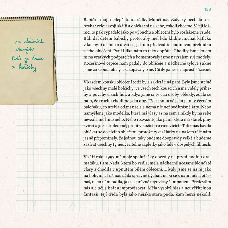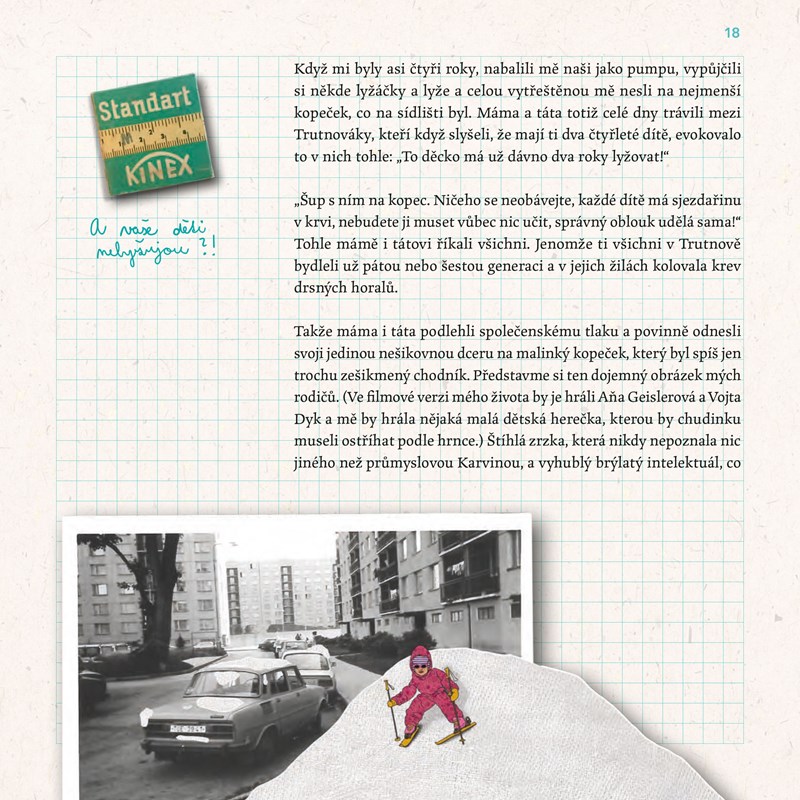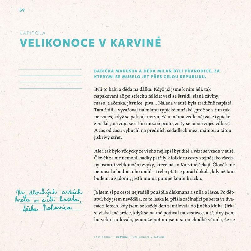 Dětství, to jsou hlavně prázdniny, babičky a dědové, ale taky videopůjčovny, tamagoči a Kačeří příběhy – aspoň pro nás děti devadesátek. Každá rodina má své příběhy a tohle jsou zápisky té moji. Jsou to vzpomínky, nad kterými se usmívám a jenom sem tam se nostalgicky dojmu – třeba nad tím, jaký to bylo retro, ty časy, kdy se seznámili naši, a ještě předtím v šedesátkách jejich rodiče. A všechno je to na fotkách! Tohle je kniha napůl moje a napůl Elišky. Její ilustrace jsou na každé straně, a proto se ta kniha nečte. Ona se prohlíží, prožívá a nasává všemi smysly.
