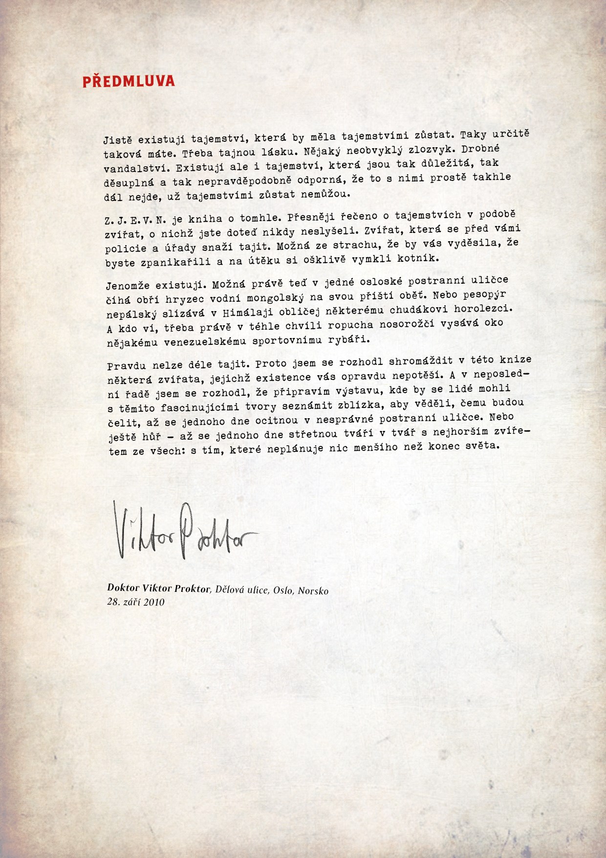 Z. J. E. V. N. je kniha o tomhle. Přesněji řečeno o tajemstvích v podobě zvířat, o nichž jste doteď nikdy neslyšeli. Zvířat, která se před vámi policie a úřady snaží tajit.