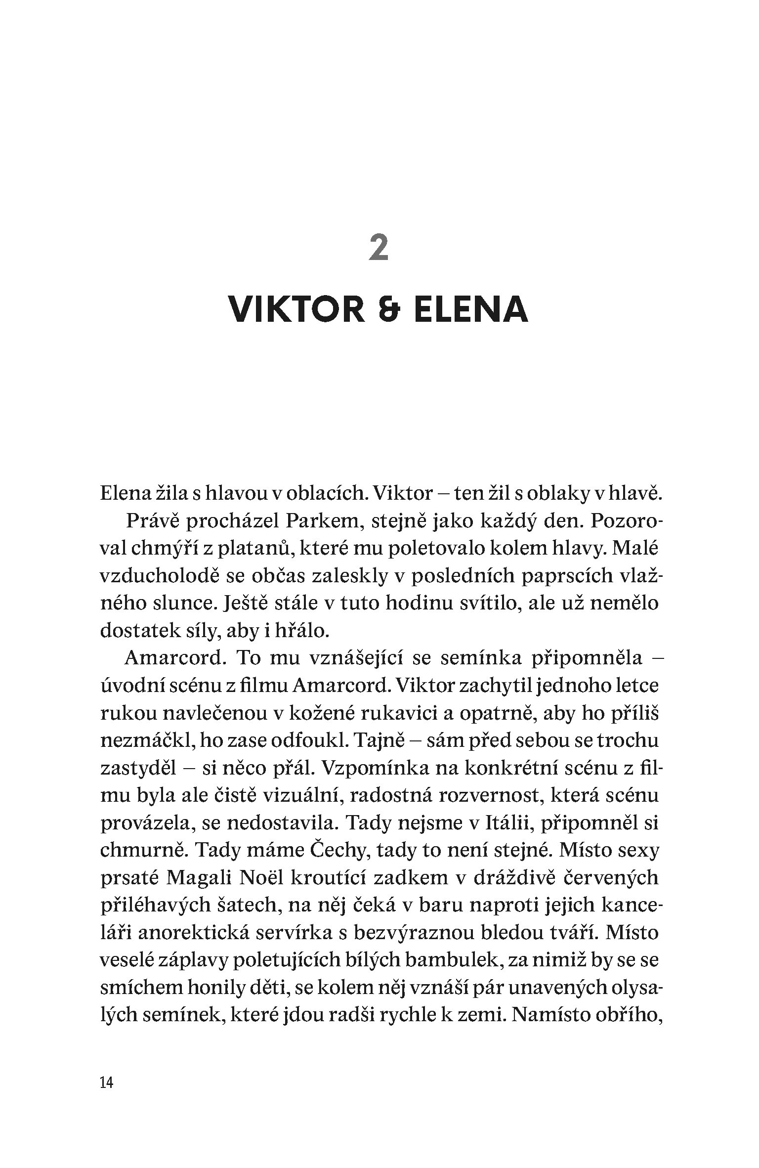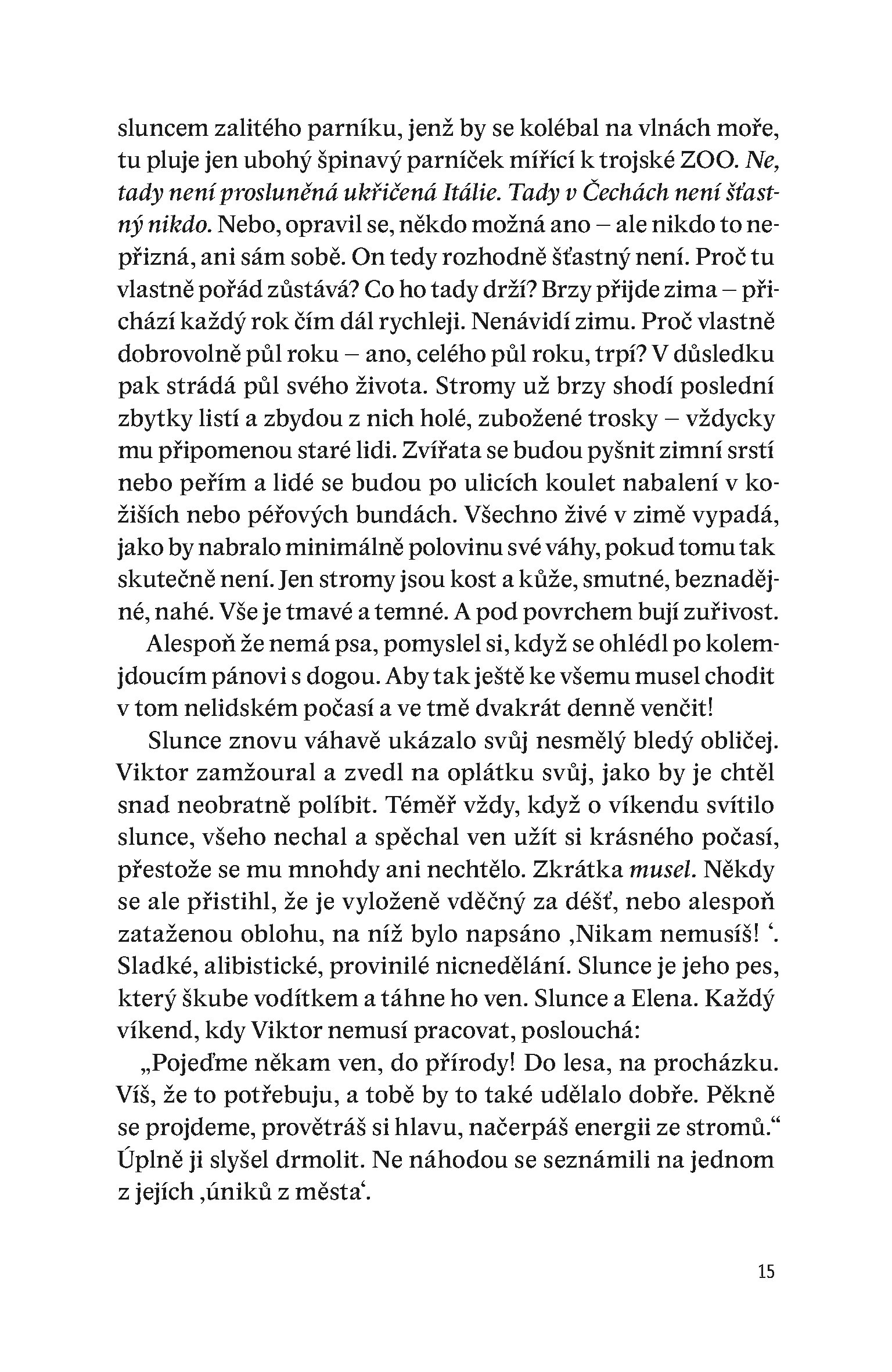 Elena, věčně optimistická učitelka jógy, má svého muže ráda, ale na jedné premiéře potká někoho, kdo ji zcela okouzlí. Do tajemné atmosféry příběhu vstupuje Oskar, kuchař, který ve volném čase venčí cizím lidem psy a má s nimi zjevně své záměry. Zatímco Viktor žije kinem a filmy, Elena se mu vzdaluje, aniž by si toho ve své zaslepenosti a posedlosti všiml. Pan Z. zatím ve své podzemní skrýši provádí věci, které se nesmí dostat na povrch, počet nevysvětlitelných vražd narůstá a vztahy se komplikují. Viktorovi se přestává dařit v práci a někomu hrozí násilná smrt. V magické atmosféře plné snů, nadějí ale také osobních selhání, podvodů a provinění se rodí drama, které změní životy všech. Neotřelá kniha o tom, jak je důležité umět odlišit (Schrödingerovu) kočku od psa, červenou od zelené a život od filmu. A také román o lásce a o tom, jaké to je, když o ni člověk přijde.