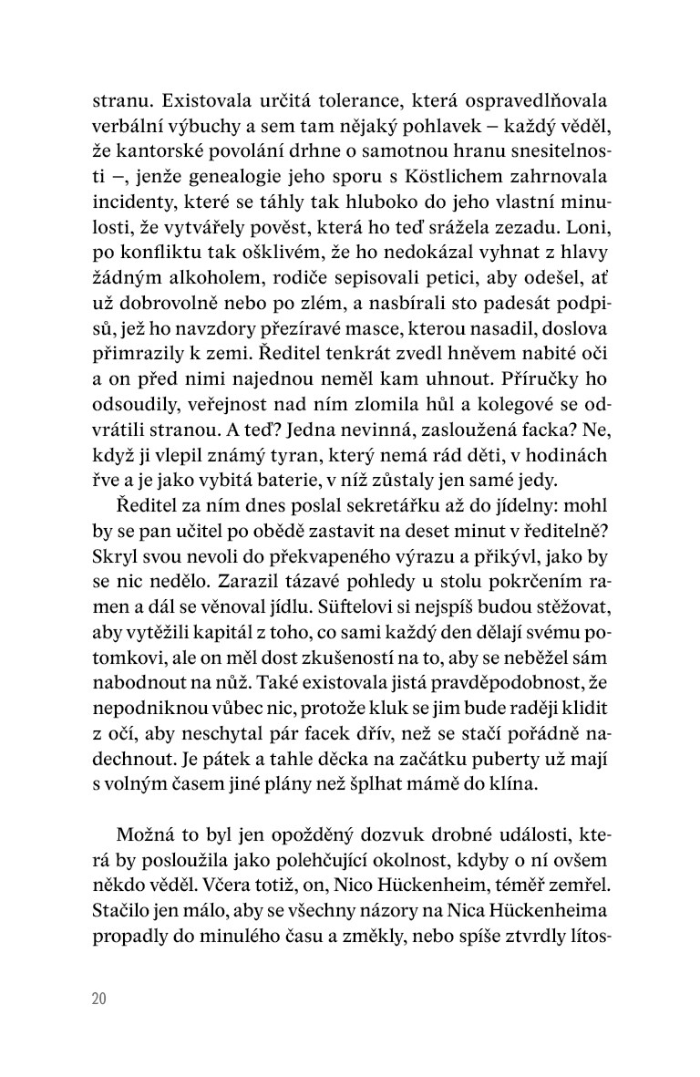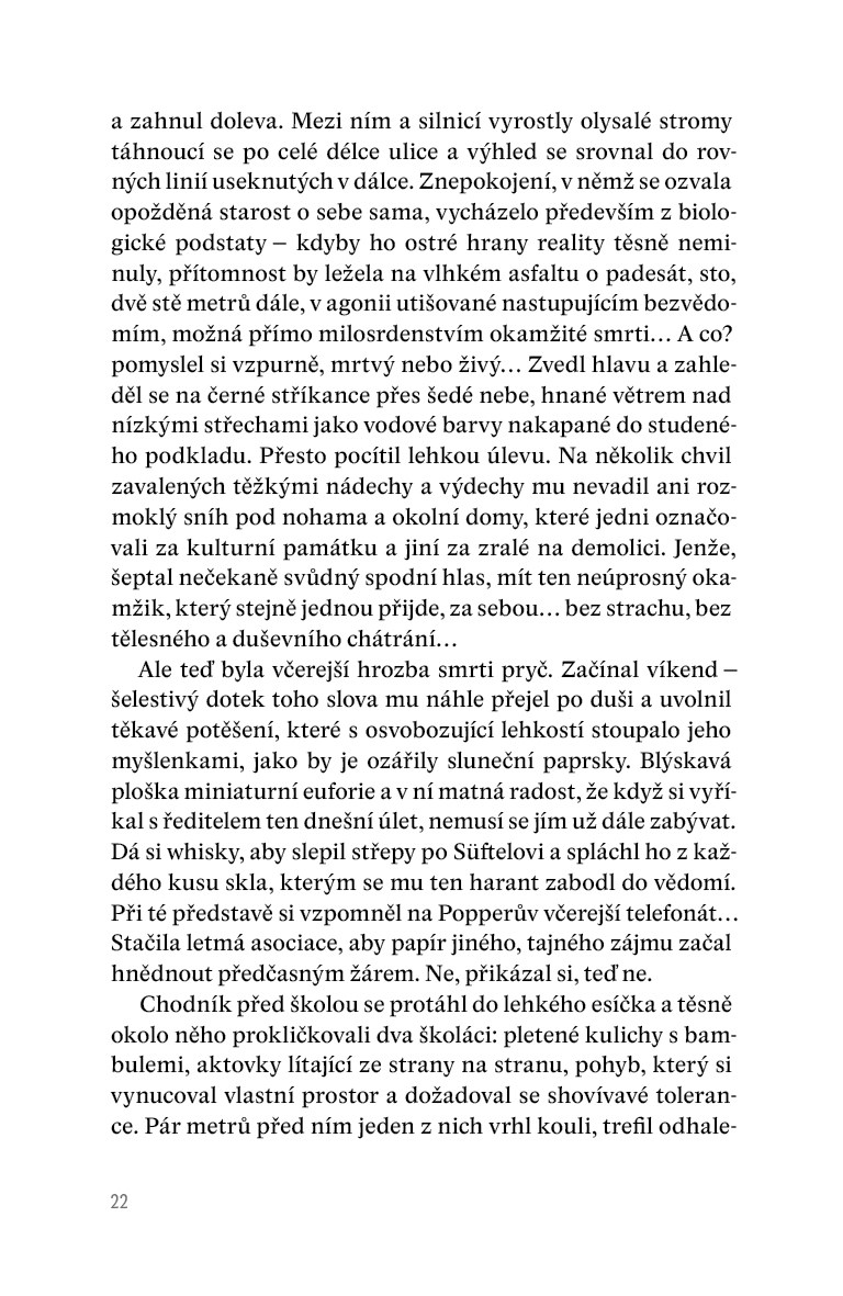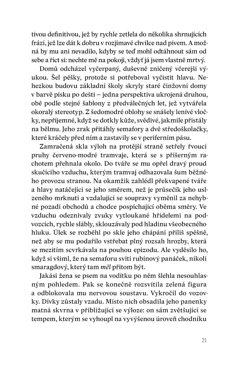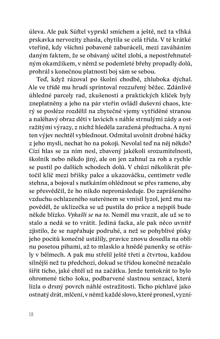 V působivém dramatu s kriminálními prvky, které odkazují na české prostředí, se postupně odkrývají nejen dilemata jednotlivých protagonistů, ale také složité plochy současné společnosti a jejích hodnotových sebeklamů. Román psaný s bezprecedentní odvahou nahlíží do míst, před nimiž česká próza až doposud zavírala oči. Stylisticky impozantní a myšlenkově nekompromisní text lze atmosférou přirovnat k některým románům Iana McEwana nebo k seriálu Temný případ.