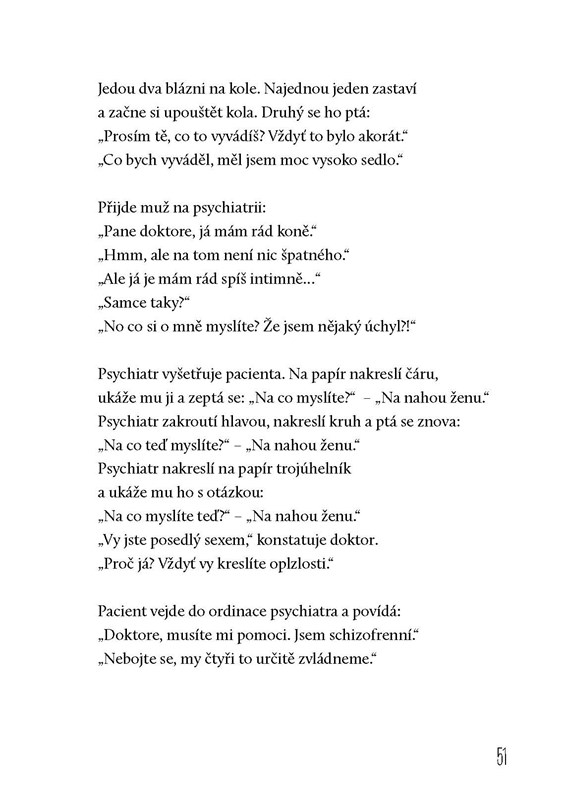 Nejlepší vtipy pěkně pohromadě, navíc s ilustracemi Petra „Pivrnce“ Urbana. Znáte třeba tenhle? „Včera jsme se s manželkou pohádali, ale stejně jsem měl poslední slovo já.“