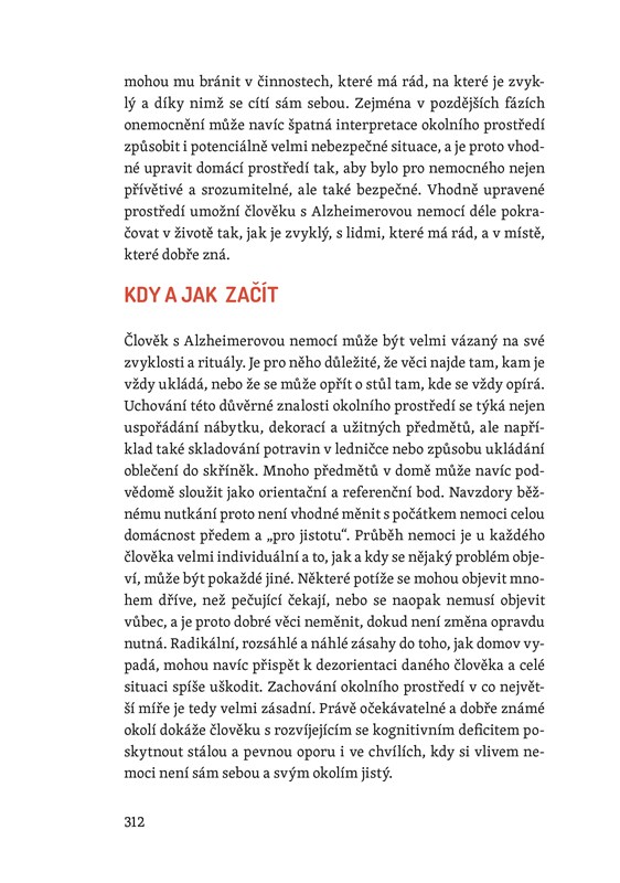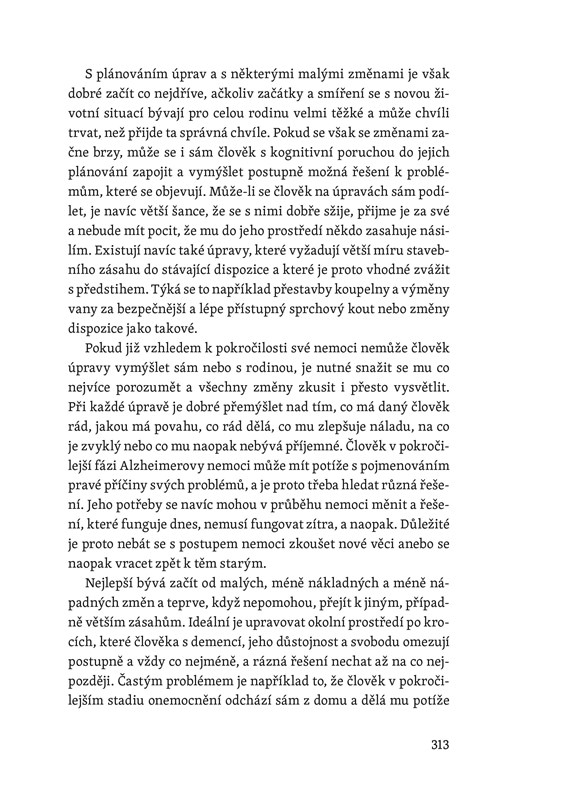 a kteří třeba do této chvíle o Alzheimerově nemoci nevěděli vůbec nic. Termínům, s nimiž se nemocní mohou setkat u lékařů či v lékařských zprávách, se však zcela nevyhýbáme. Zároveň může být tato kniha obohacením a inspirací také profesionálům a zájemcům z řad studentů. Stojí za zmínku, že není potřeba knihu číst od začátku do konce. Každý čtenář si může přijít na své u jiných částí. Některého může více zajímat, jak se onemocnění projevuje, jaký lékařský postup v tom či onom období očekávat, jiného možná více zajímá, jak nemocného podpořit a jakou pomoc mu nabídnout. V neposlední řadě jsou jistě i čtenáři, které více do hloubky zajímá struktura a funkce mozku, a způsob, jakým onemocnění jeho funkce narušuje. Čtenář si dle obsahu může vyhledat pasáže, které jsou z hlediska jeho otázek a potřeb právě aktuální a k vynechaným pasážím se může vrátit později.