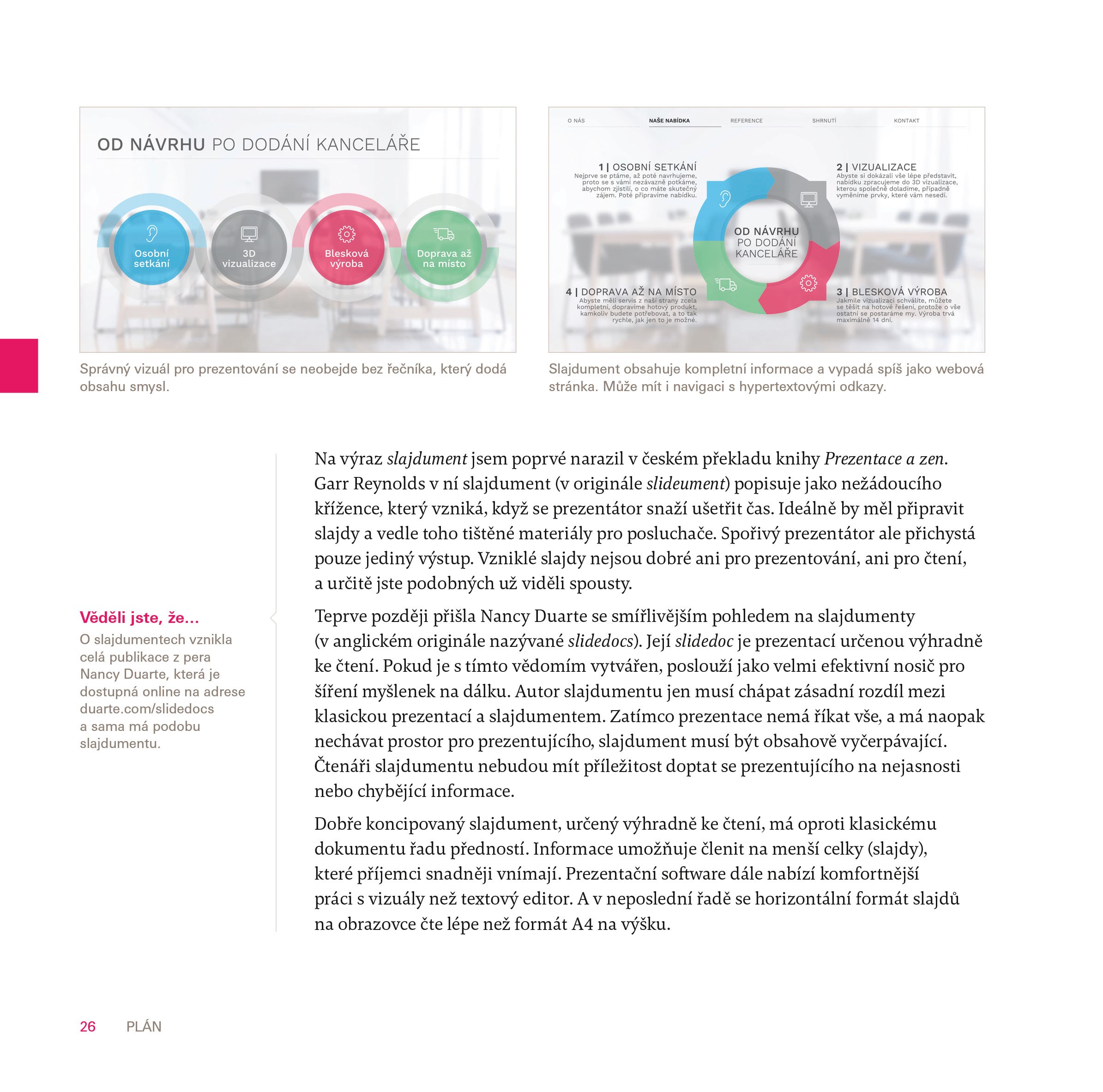 Prezentace nemusí být nutně synonymem pro vyumělkované slajdy, nesrozumitelné blábolení a mrhání časem. Tato dovednost se dá naučit, vyžaduje jen trochu pokory, pochopení zákonitostí lidského vnímání a respektování ověřených postupů.