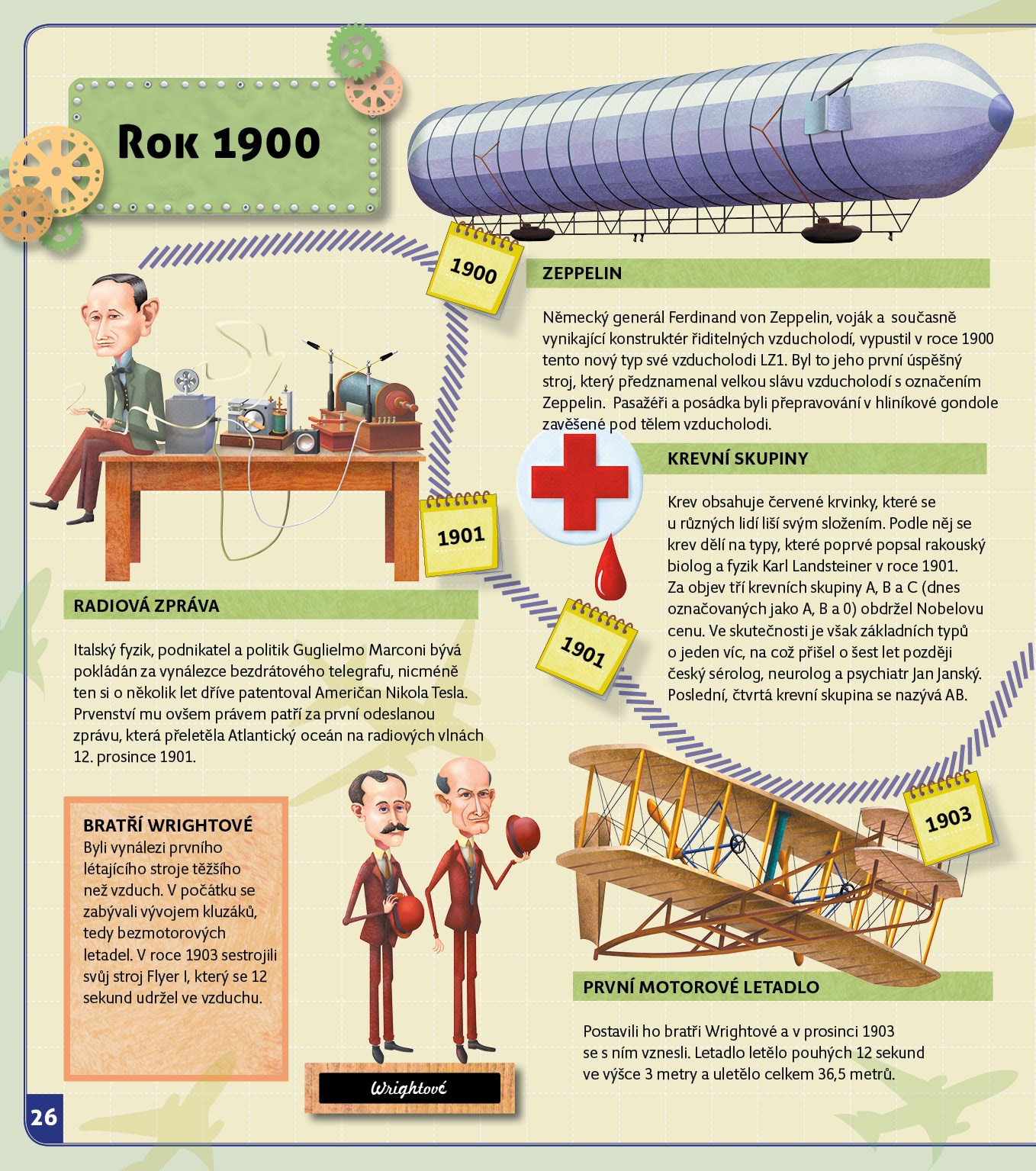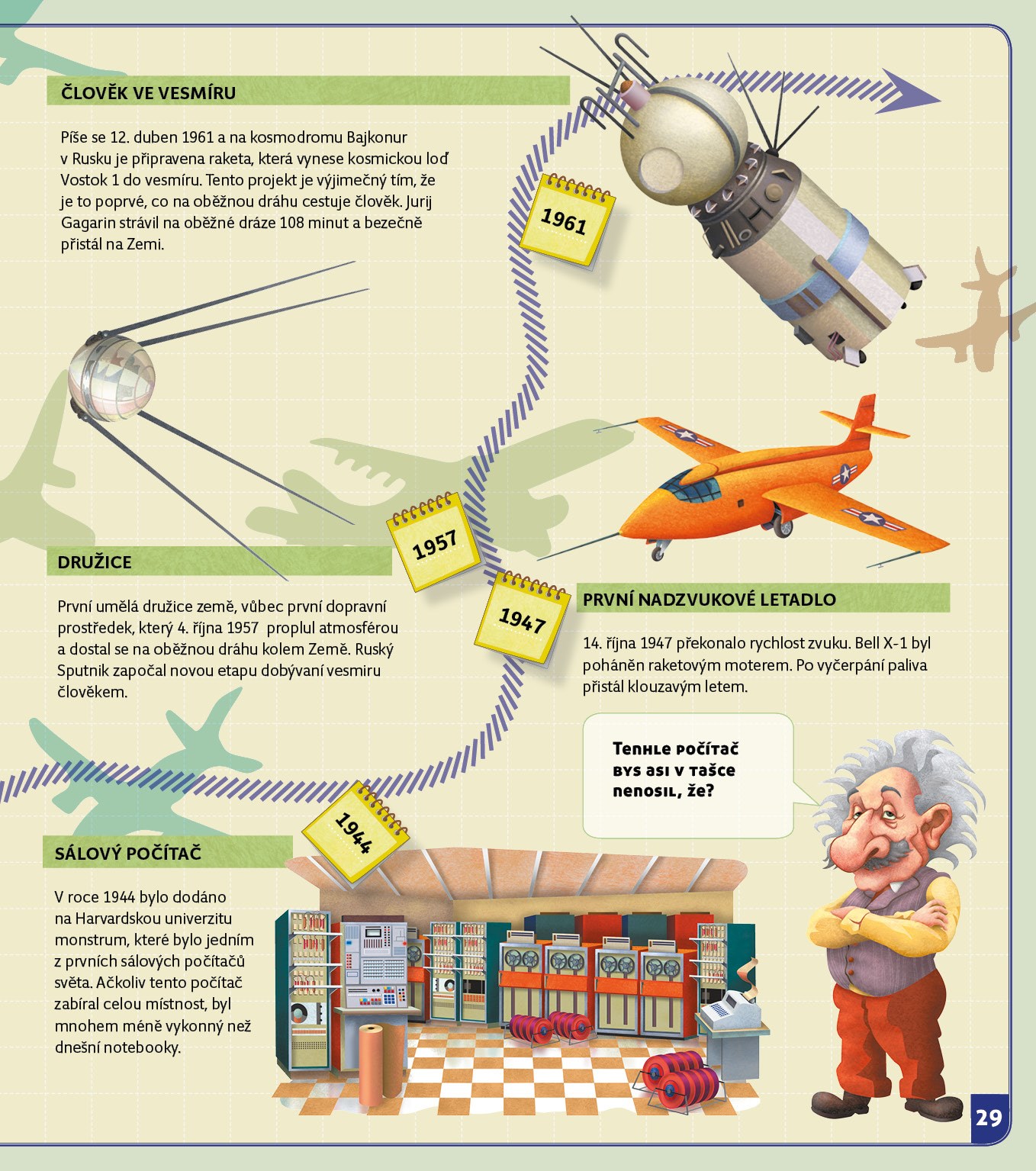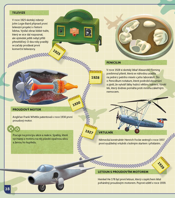 Začneme v roce 3500 před naším letopočtem, abychom si řekli něco o klínovém písmu a vynálezu papíru, kola nebo počítadla. Vynálezů, které dnes vypadají samozřejmě, ale v době, kdy vznikly, bylo k jejich objevu třeba větší fantazie, než k vývoji dnešních technických vymožeností. Skončíme u moderních technologií, tabletů a supermoderních letadel. Spolu s Albertem procestujeme časem všechna významná století, v nichž se něco důležitého vynalézalo a o každém vynálezů si řekneme to nejdůležitější. Na závěr vše shrneme v přehledných časových osách. Jsi-li připraven, cesta napříč časem může začít.