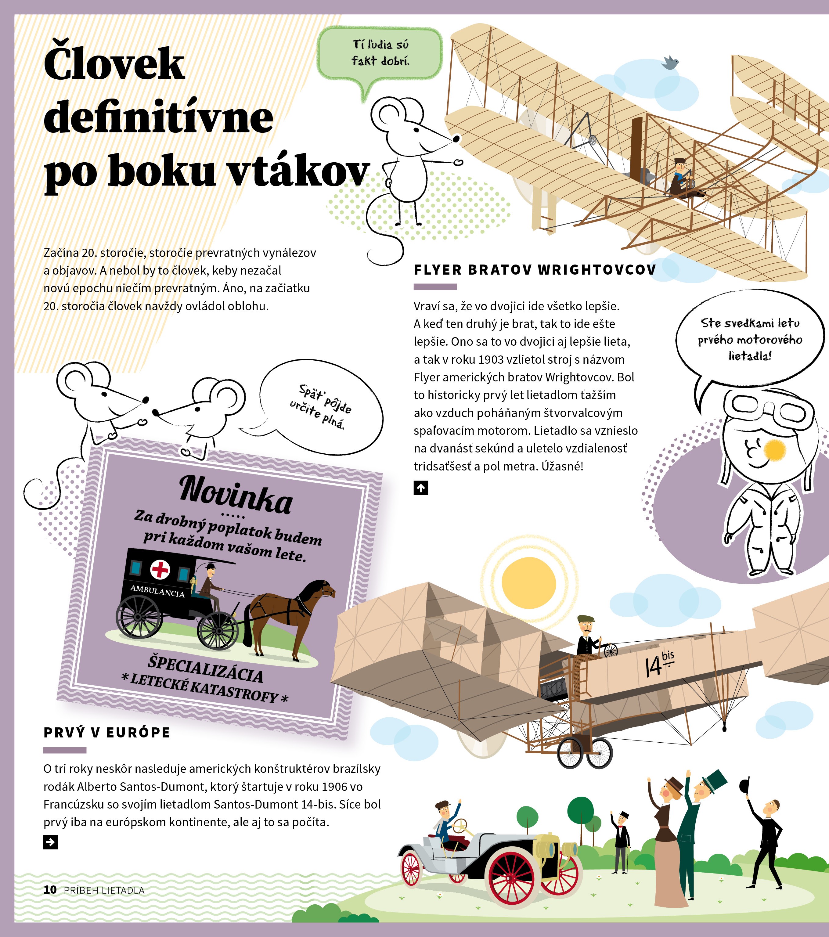 Človek od nepamäti zasnene hľadí na oblohu a pozoruje vtáky. Túži sa im vyrovnať a pozorovať svet z výšky. Ak by neexistovali odvážlivci, ktorí to skúsili, možno by ľudia závideli vtákom dodnes. Od prvých naivných pokusov s vtáčími krídlami cez zložitejšie klzáky a lietadlá, ktoré sa dokázali udržať vo vzduchu len pár minút, až po supermoderné nadzvukové lietadlá ubehli celé storočia. Bol to dlhý príbeh, ale bol to príbeh so šťastným koncom.