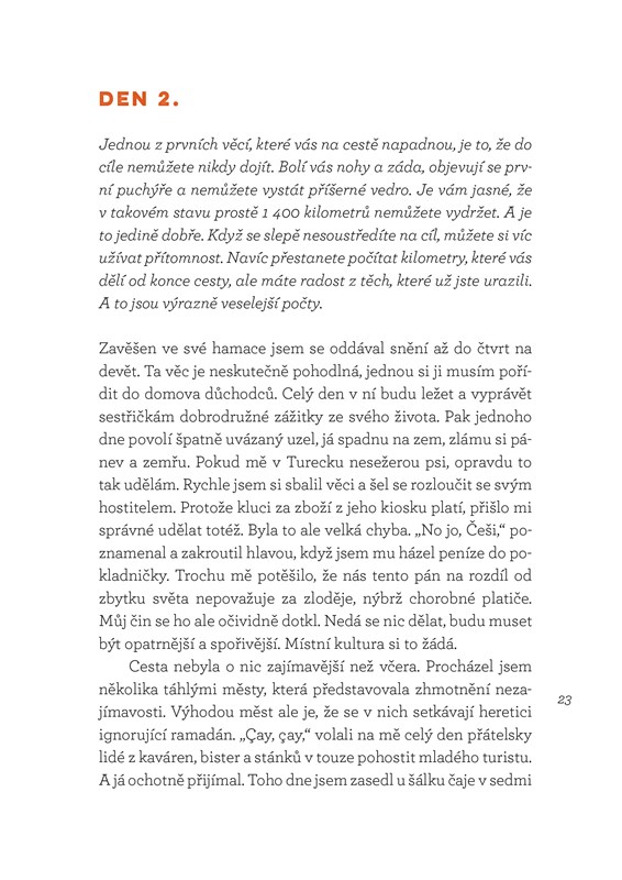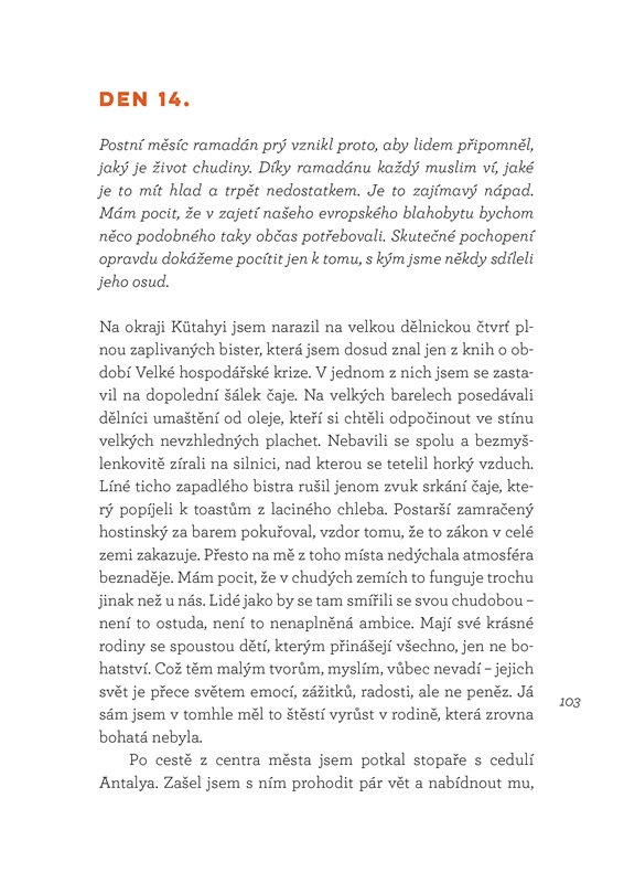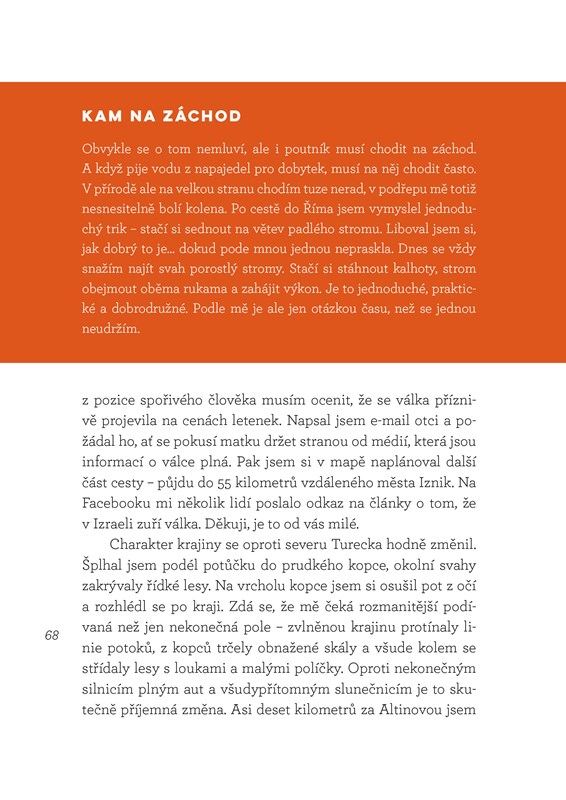 Jeho kniha je pozoruhodnou kombinací nadsázky a vtipu, které střídají častá zamyšlení nad vážnými tématy. Hlavním motivem je zde autorova pouť do Jeruzaléma, na kterou se vydal loni v létě. Bez mapy a orientačního smyslu se mu podařilo ujít 1400 kilometrů napříč rozpálenou krajinou Turecka a Izraele, stanout pod Zdí nářků a prožít nezapomenutelné dobrodružství.