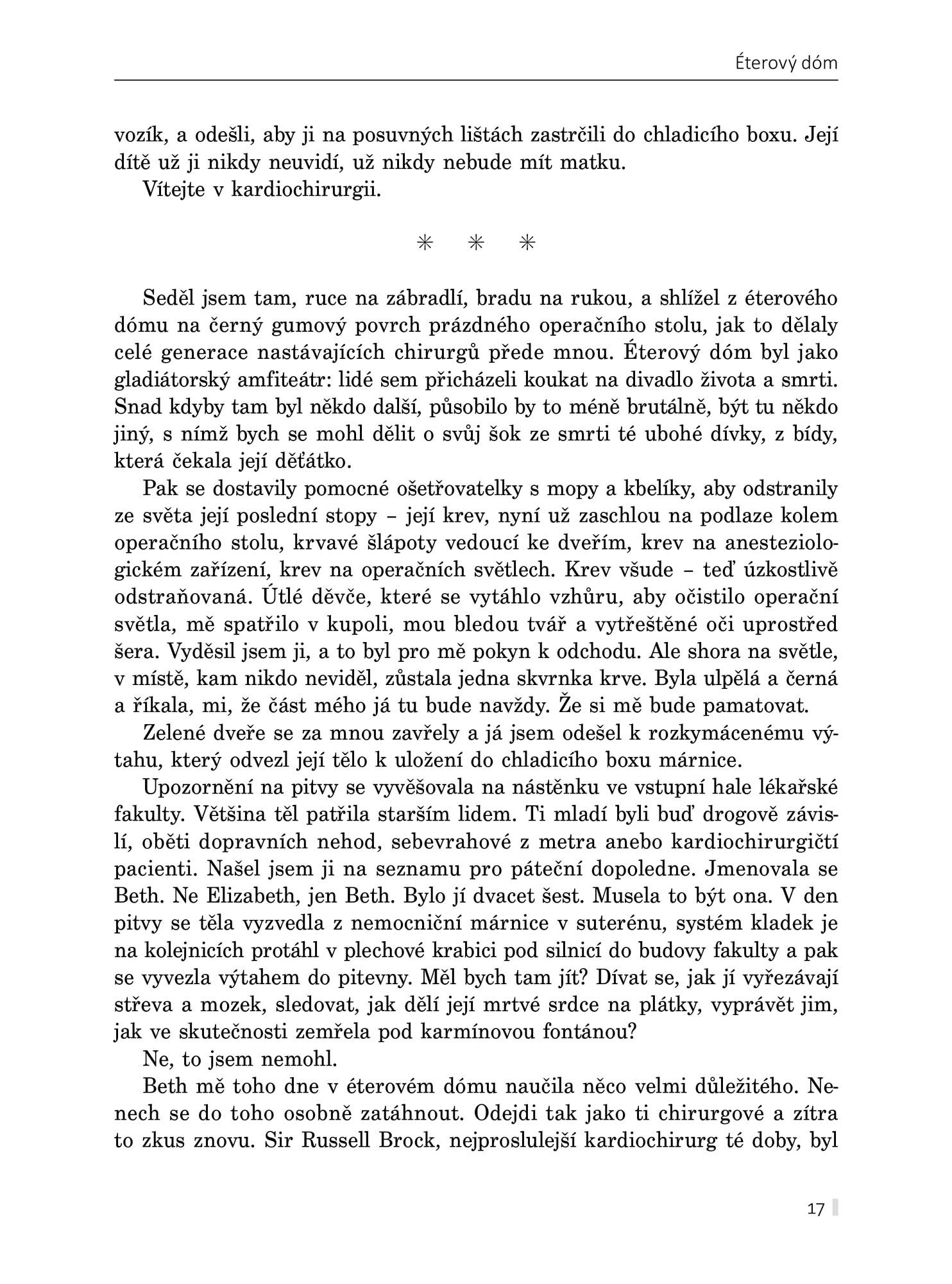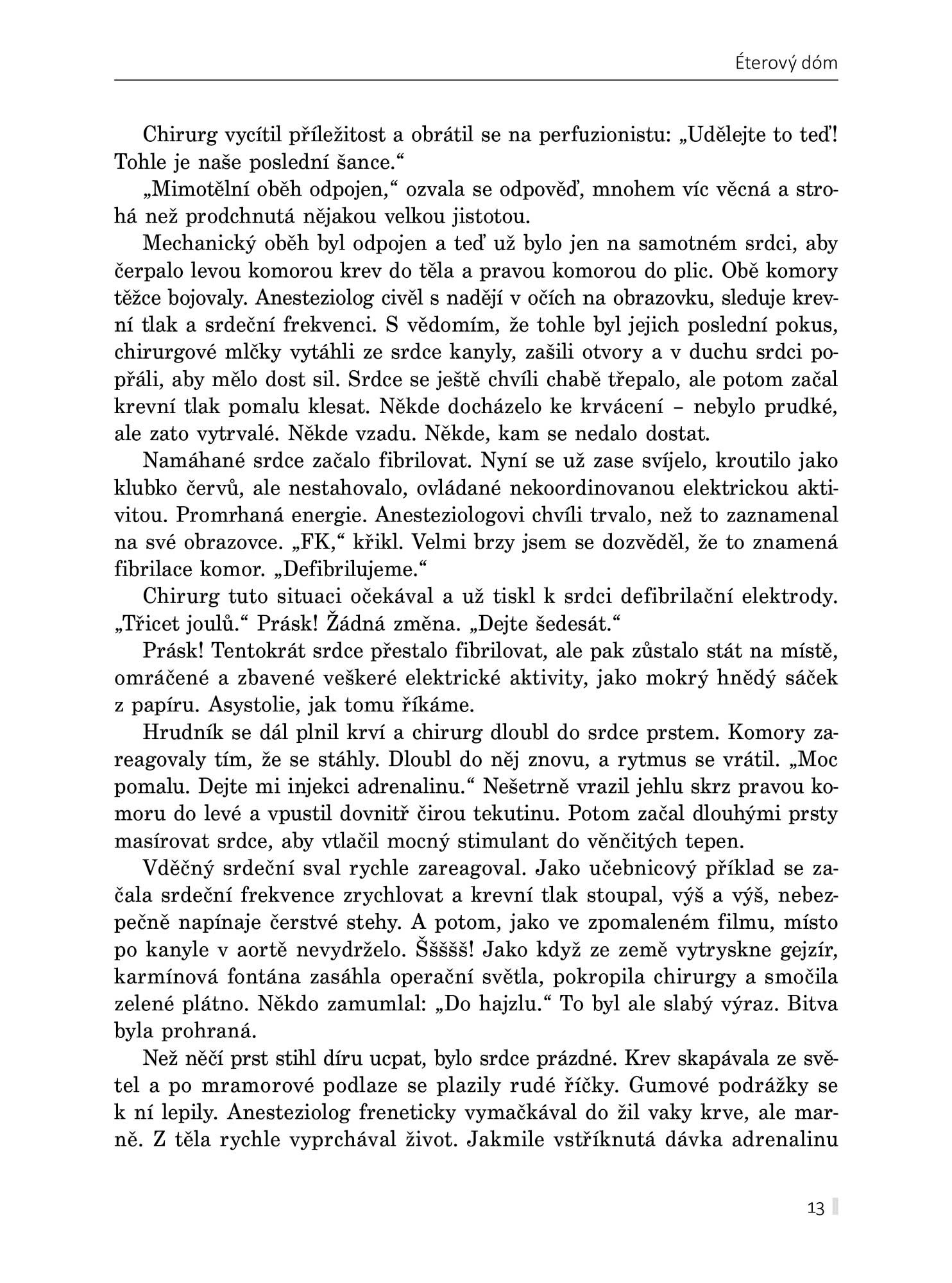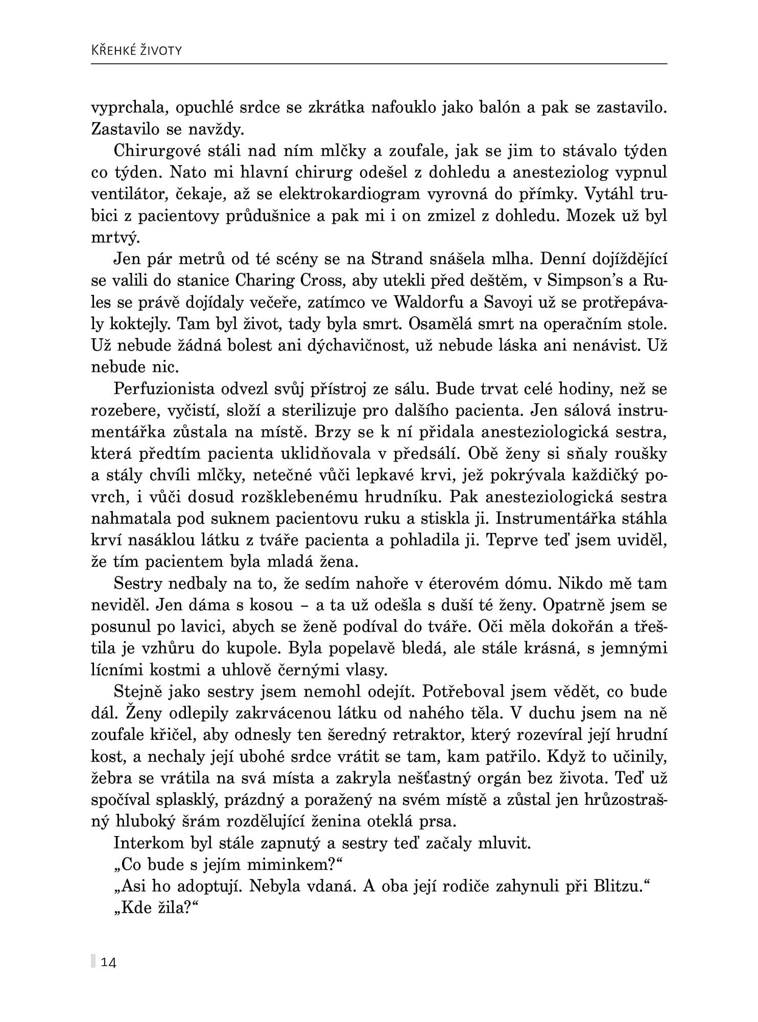 Nabízí výjimečné nahlédnutí do někdy opojného, jindy tragického světa kardiochirurgie a dává tušit, jaké to je, mít v rukou něčí život nebo smrt. Se zatajeným dechem budete číst neuvěřitelné příběhy, jako například osud miminka, které za sebou už v šesti měsících mělo sérii infarktů, či muže „kyborga bez pulzu“, který osm let žil s titanovou krevní pumpou připojenou na externí baterie pomocí zástrčky voperované do lebky.