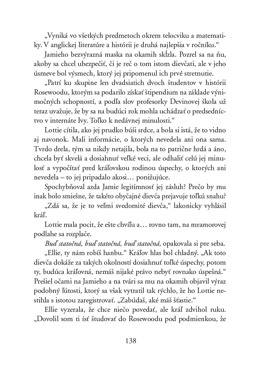 Je množstvo dievča, ktoré odmalička sníva, že raz bude princeznou. Presne taká je aj Lottie. Po ničom inom netúži viac, než zistiť, že má kráľovský pôvod. Namiesto toho však dostane spolubývajúcu, ktorá je skutočnou princeznou, avšak si to vôbec neužíva a najradšej by bola len normálnym dievčaťom. Preto sa im obom zdá, že vymeniť si role bude najlepší nápad. Zo začiatku to vyzerá úplne jednoducho, no po istom čase vysvitne, že to nebolo práve najlepšie riešenie. Ellie a Lottie sa od seba úplne odlišujú. Lottie je na všetkých milá, má vždy dobrú náladu, svet je podľa nej krásnej miesto a všetko vidí na ružovo. Ellie je k ľuďom odmerná, drzá a vôbec sa nespráva tak, ako sa od nej očakáva. Aj napriek tejto značnej odlišnosti si k sebe našli cestu a začali spolu vychádzať. Bolo naozaj zábavné sledovať do akých rôznych situácií sa vďaka tejto zámene dostali a čo všetko to prinieslo. Okrem nich sa na scéne objavilo už len pár vedľajších postáv, ktoré zohrali výraznejšiu úlohu. Autorka sa však vo výraznej miere zamerala aj na to, aby ukázala ako fungujú súkromné školy - na závisť, ktorá tu panuje nielen medzi žiakmi, ale aj učiteľmi, žiarlivosť, množstvo intríg, či súťaživosť, ktorá je často úplne prehnaná. Nemala nasadené ružové okuliare a netvárila sa, že je tu všetko úplne perfektné.