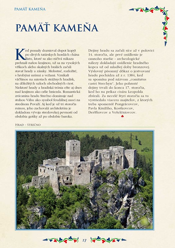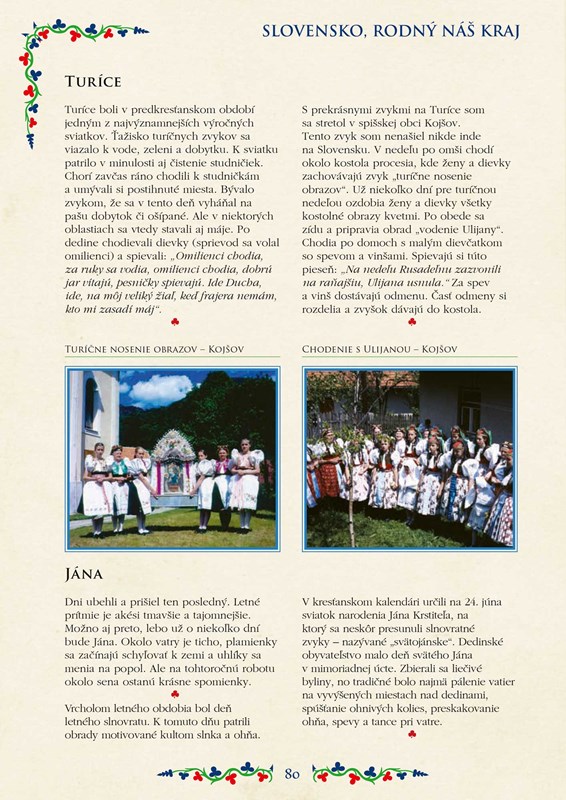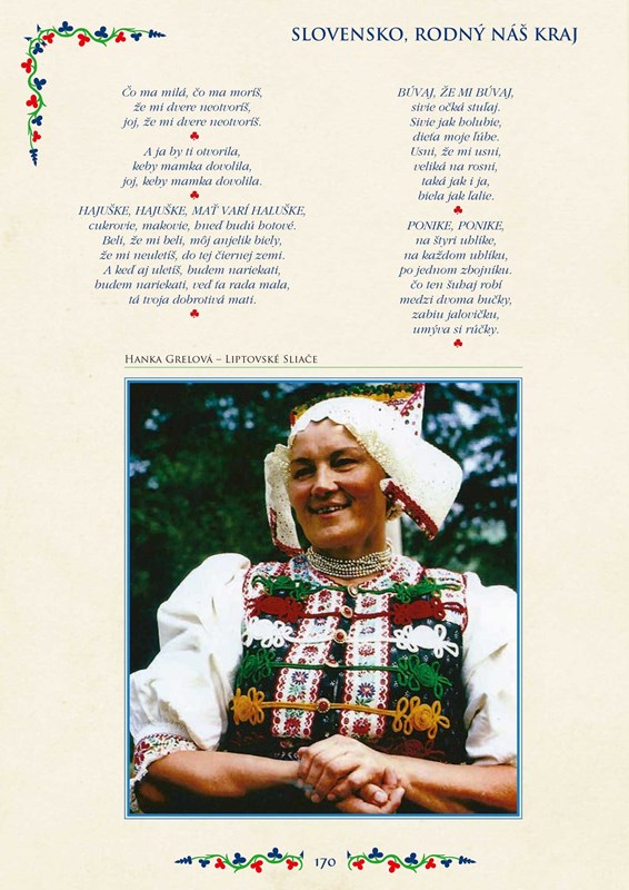 Kniha ponúka náhľad do viacerých zákutí Slovenska – najprv zavítate na púť spenenými prúdmi horských bystrín, neskôr sa dotknete neba končiarmi vysokých vrchov, potúlate sa horou, ktorá človeku odpovie ozvenou a hneď sa cíti lepšie, navštívite pamiatkové rezervácie ľudovej architektúry, zoznámite sa s tradičnými slovenskými obyčajami rozdelenými podľa ročných období, prečítate si o typických zvykoch na svadbe, okúsite čaro ľudových remesiel od výšivkárstva cez čipkárstvo a hrnčiarstvo až po medovnikárstvo a popri tom sa započúvate do tradičných ľudových piesní, ktoré sa šírili z pokolenia na pokolenie.