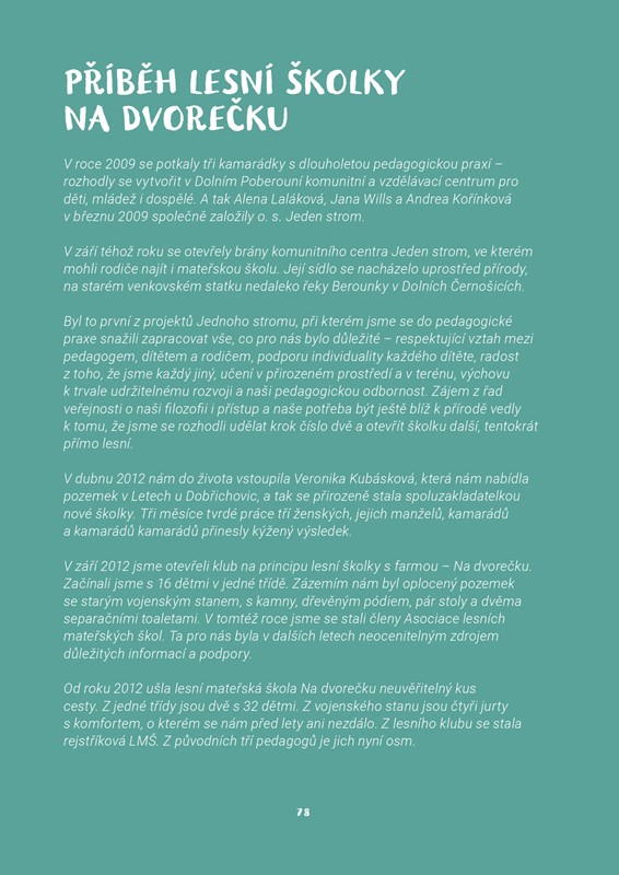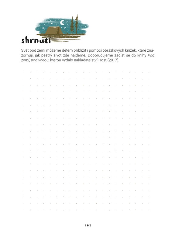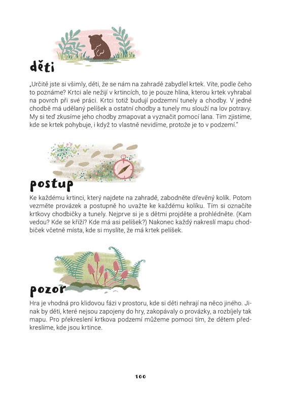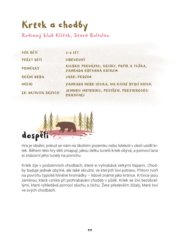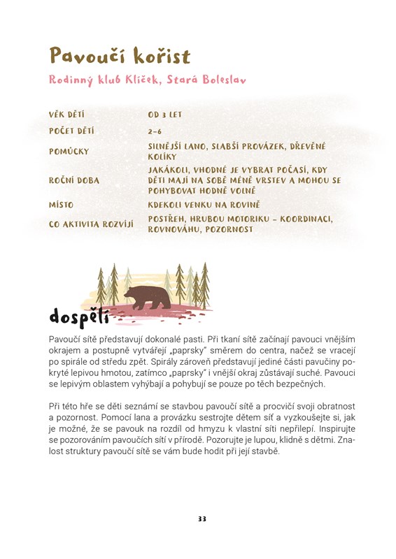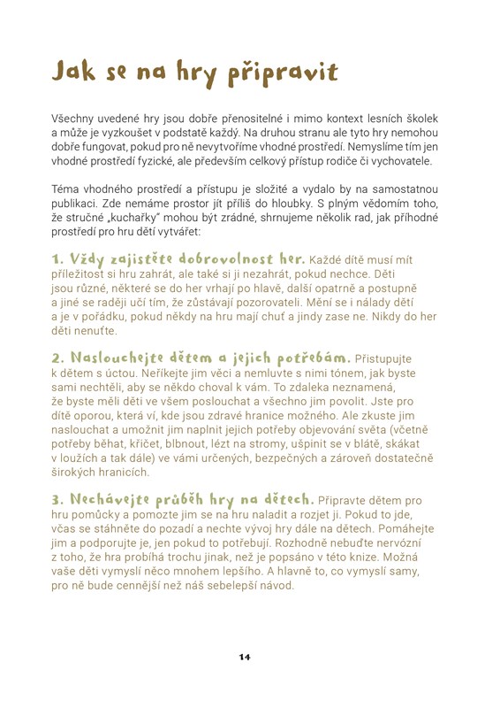 „Tato knížka je terénním průvodcem pro rodiče a vzdělavatele, který vám ukáže, jak děti zvednout, dostat ven a rozhýbat k aktivitě. Zakládá se na odvěkých hrách, které odpradávna fascinovaly děti po celém světě – na stavění skrýší, cestách za dobrodružstvím, popouštění uzdy fantazie – a nabízí praktické, vyzkoušené a jednoduše použitelné tipy a návody, jak si hrát a prozkoumávat přírodní prostředí s dětmi. Udělejte si s dětmi poutní hůl, postavte s nimi domky pro víly, skákejte hop a skok přes potok – a další nápady brzy začnou přinášet děti samy. Tato kniha, plná krásných her a nápadů z českých lesních školek, budiž vstupenkou k vašemu zotavení a posílení při hře venku s dětmi.“