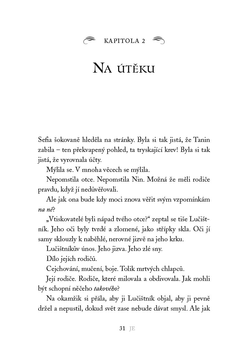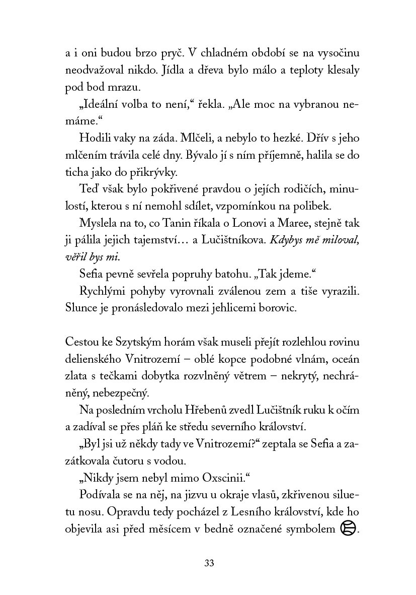 Sefia a Lučištník jsou na útěku. Lučištník však neprchá jen před Gardou, ale i před děsivými nočními můrami. Věří, že se jich zbaví, když se mu podaří osvobodit všechny chlapce, které vtiskovatelé drží v zajetí. A tak bitva střídá bitvu a z laskavého kluka se stává zasmušilý voják, který touží po nových střetech. I když mu Sefia v boji pomáhá, jeho proměna ji děsí. Nepřestává proto studovat tajemnou Knihu. Zjišťuje, že vlákna Lučištníkova osudu jsou propojena se zradou jejích rodičů. Pokud chtějí zabránit válce mezi královstvími, která je na spadnutí, musí zastavit Gardu a zničit její plány…