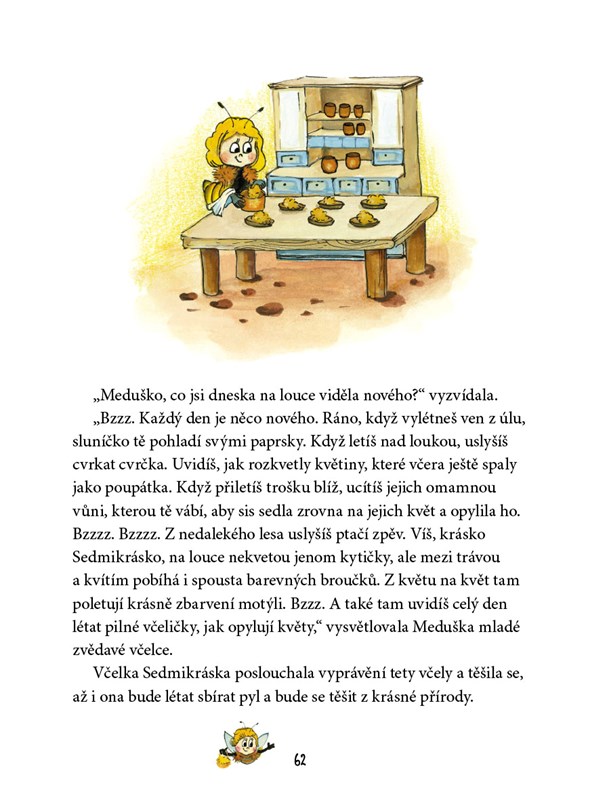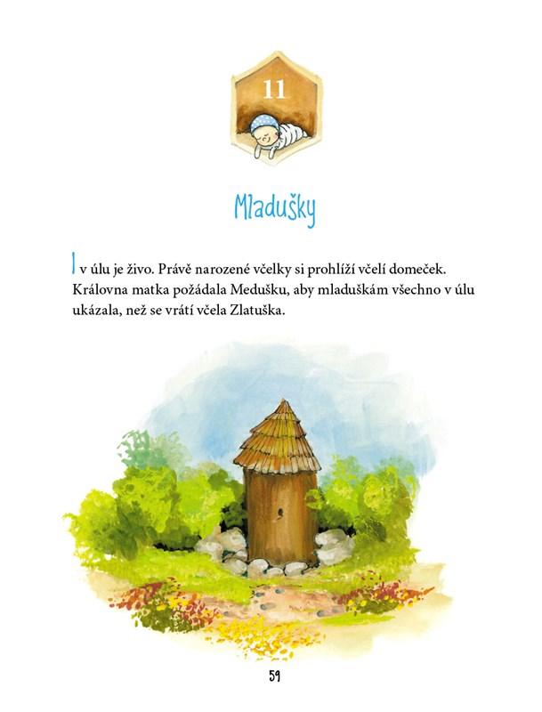 Meduška je včelka průzkumnice. Od jara do podzimu poletuje po rozkvetlé louce a hledá pro ostatní včely květy s tím nejlepším pylem. I když má práce nad hlavu, vždycky si najde čas na zvídavé otázky malé včelí larvičky a vypráví jí o tom, jak to chodí v úlu a kdo má co na starosti.