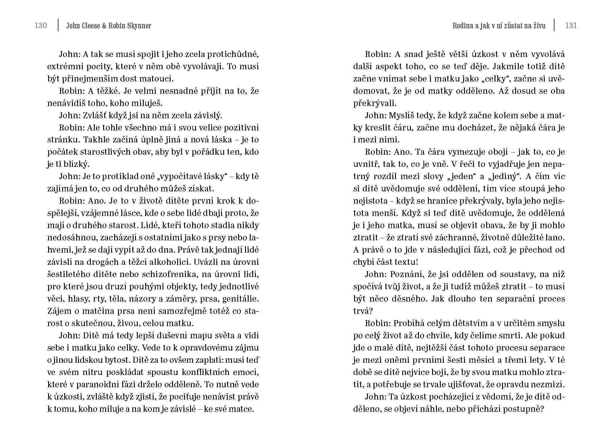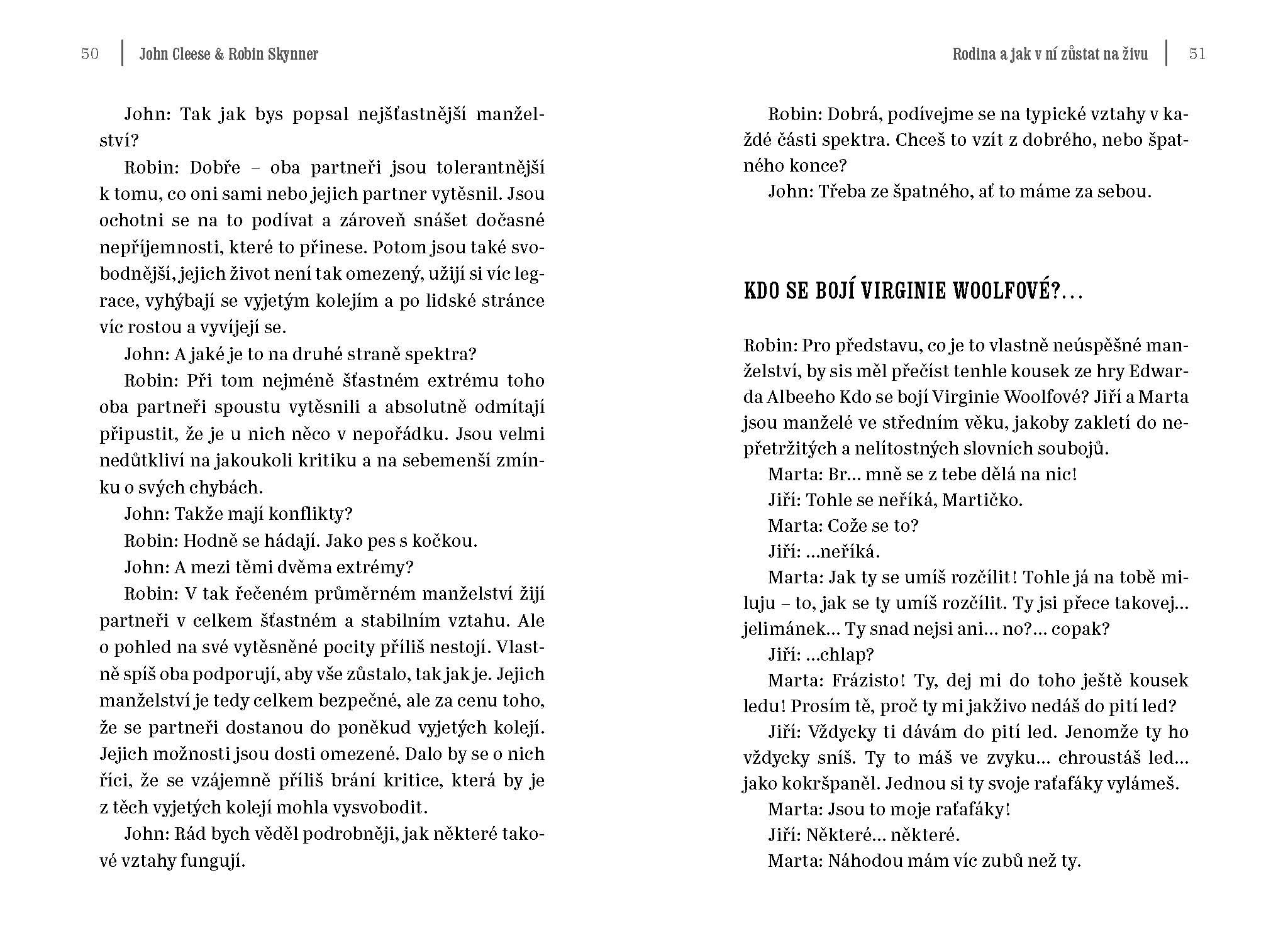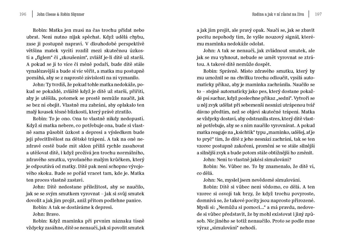Mezi Cleesem a jeho psychiatrem se časem vytvořil živý přátelský vztah. Jedna z nejzdravějších lidských reakcí na těžkou a leckdy i bezvýchodnou situaci je humor a vtip – a v této knize si užijete obojího. Hlavním tématem dialogu je rodinný život, jeho krize, jejich příčiny a cesta, jak se z nich dostat.