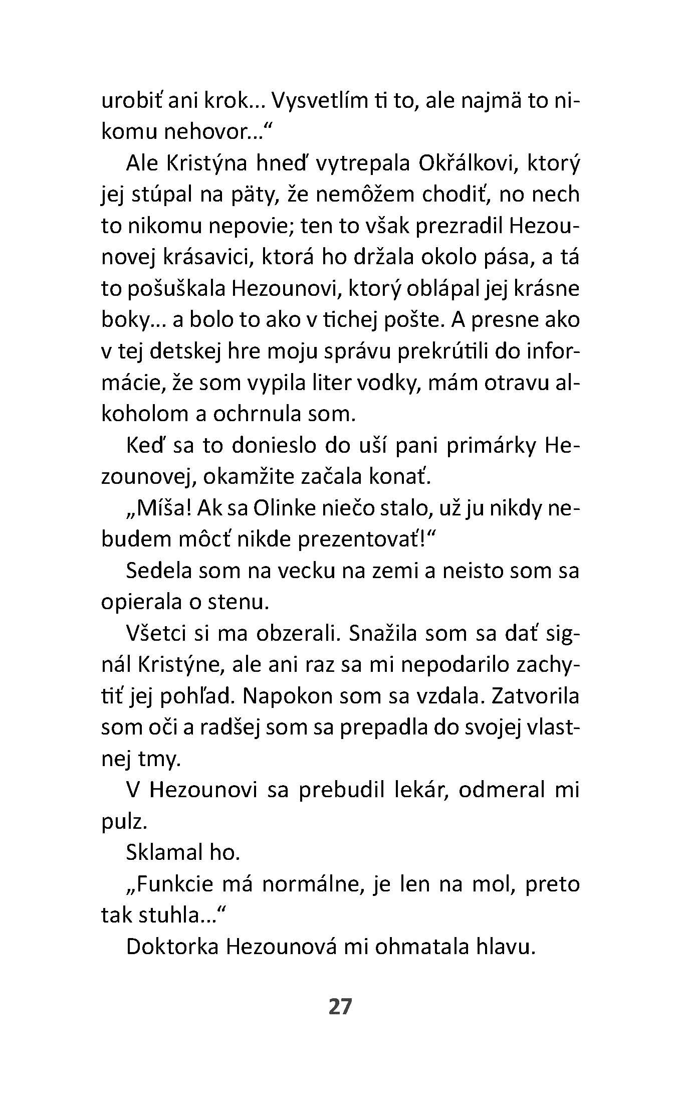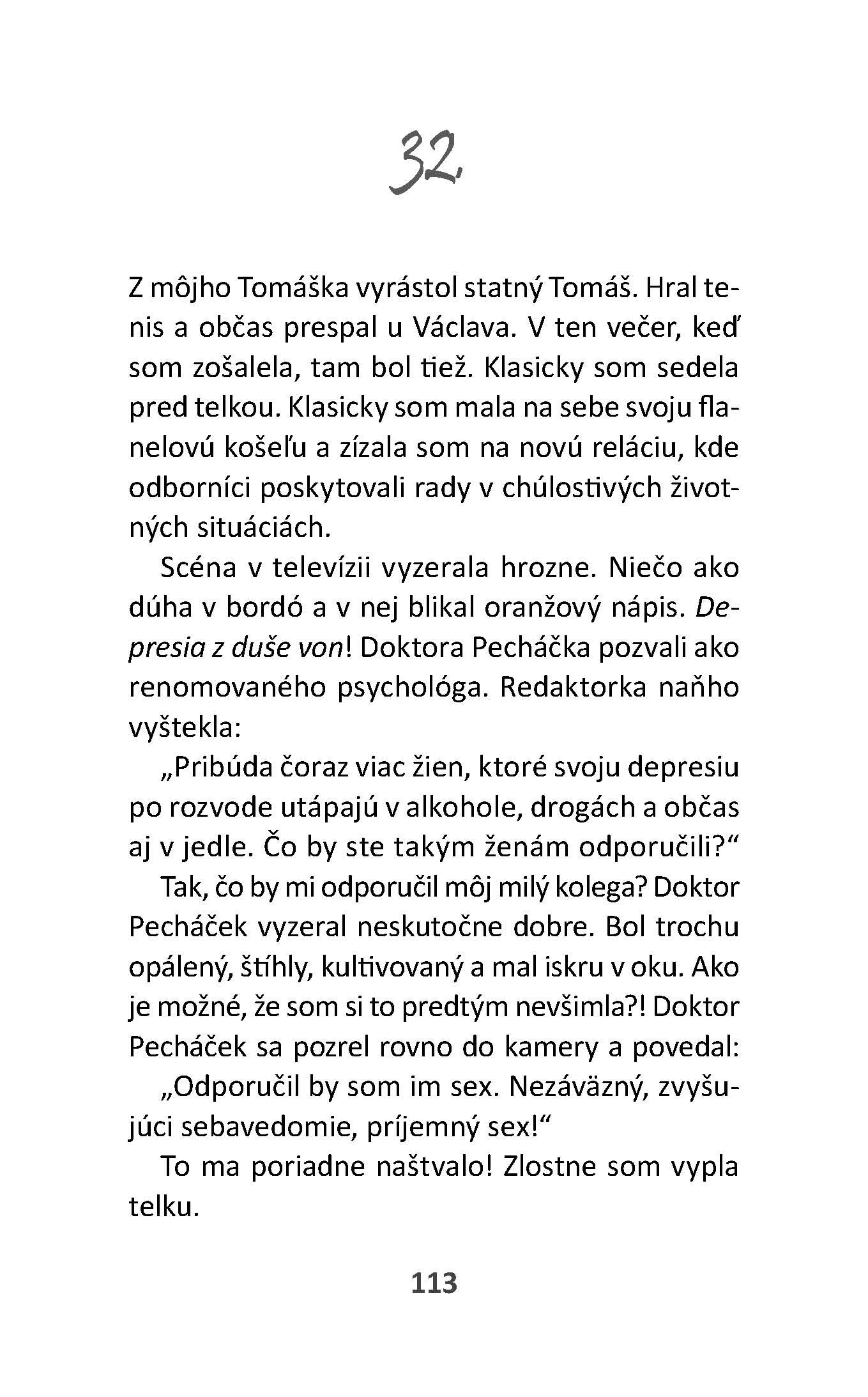 Ja som Václava ľúbila. Vôbec som si nevedela predstaviť, že by som chodila s niekým iným, a keby som bola čo len trochu viac nábožensky vychovaná, tak by som každý večer zdvihla hlavu k nebesiam a ďakovala by som Bohu, že mi zoslal takého dokonalého muža. Dokonalý bol preto, že vôbec existoval! Že bol zdravý, meral viac ako meter osemdesiat, mal vlasy, zuby, nešušlal a chcel ma! To bolo najdôležitejšie – chcel ma. Keby slintal, bolo by mi to nakoniec asi jedno... hoci... hoci... všetko šlo tak rýchlo!