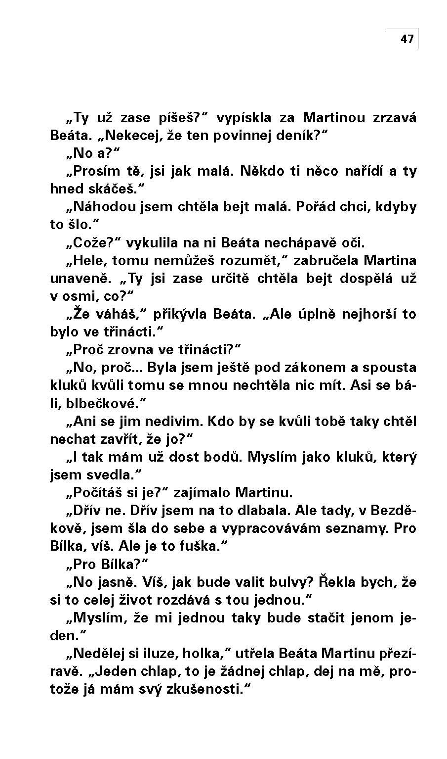Martina vyrůstala pouze se zamindrákovanou matkou. Veškerá výchova směřovala k tomu, aby se z dcery nestala boubelka. Nesmí být tlustá, osamělá a nešťastná jako máma. Martina tedy kopíruje matčiny nepřetržité diety, až se odmítáním jídla dostane na okraj propasti. Ač se nenávidí za to, co dělá, nemůže si pomoct. Teprve když pozná, že i do dívky, jako je ona, se někdo může zamilovat, zatouží odrazit se ode dna.