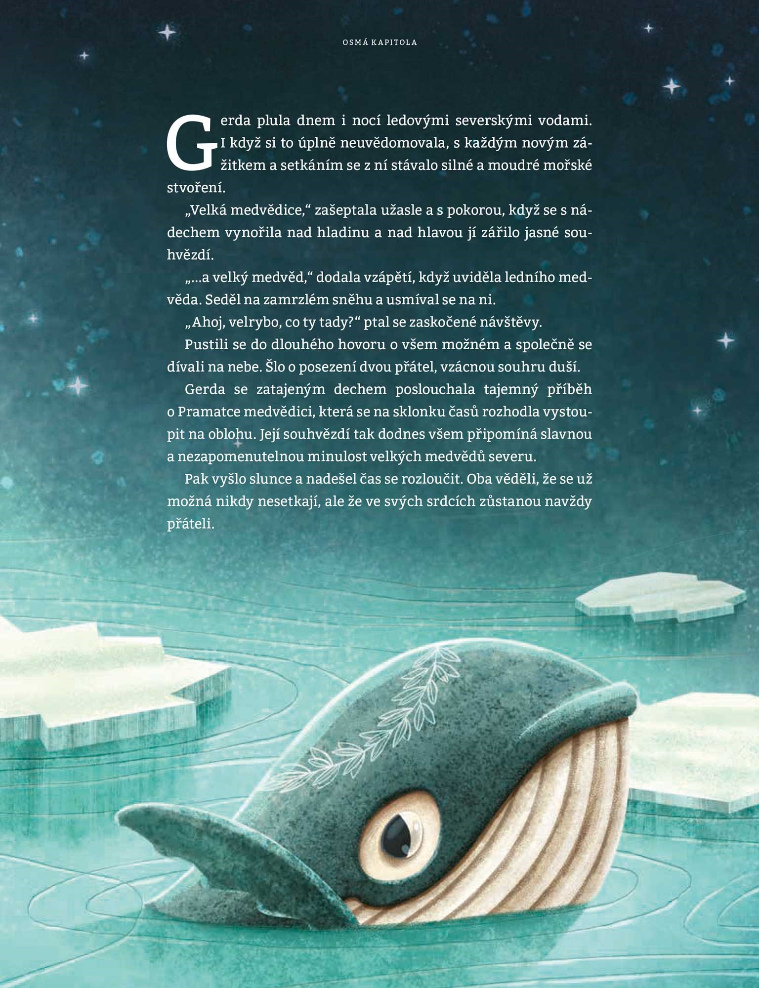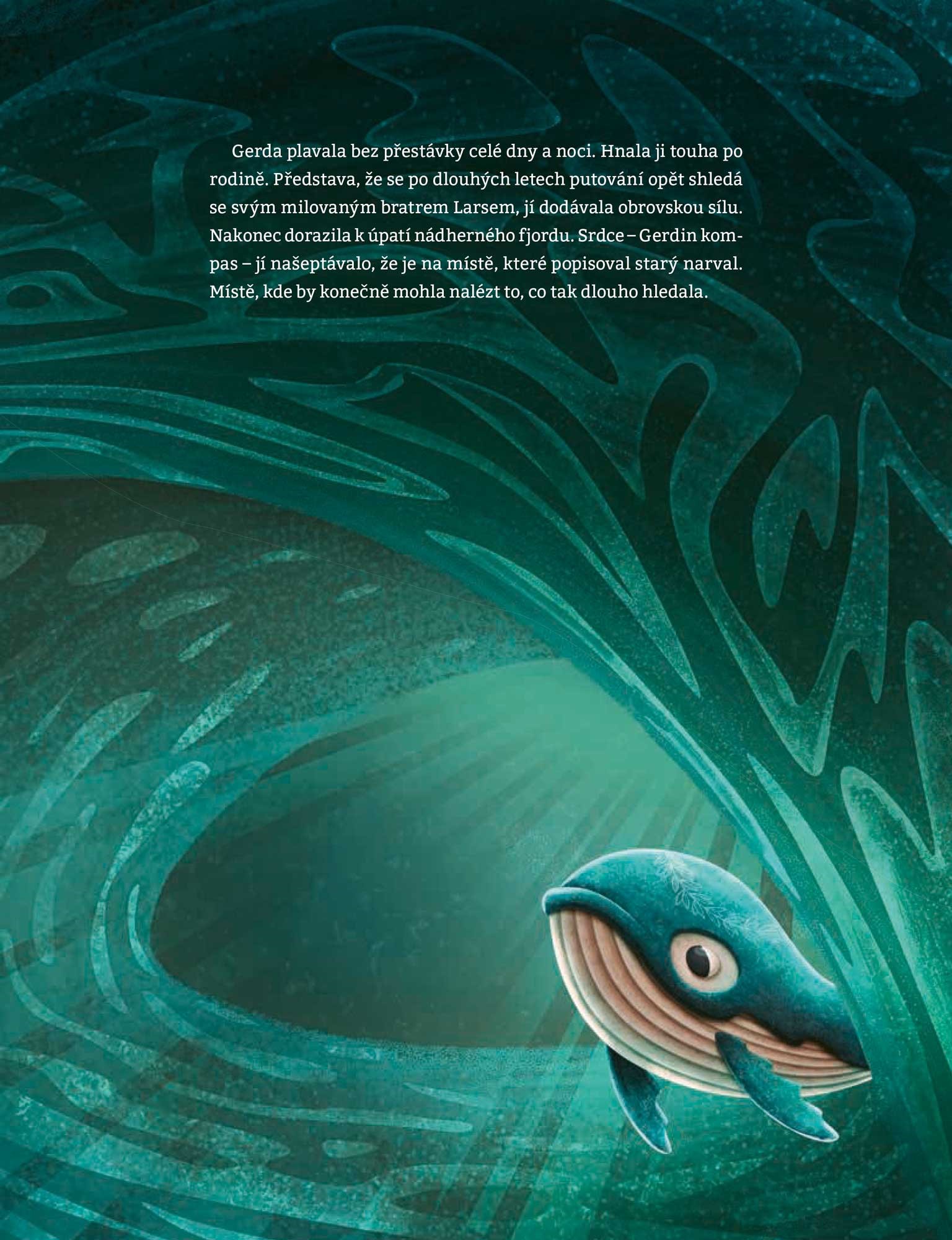 Malá velryba Gerda si užívá spokojené dětství. Jednou se však přihodí něco nečekaného a Gerda zůstane sama, bez rodiny. A tak osamocená a smutná bloudí oceánem, až nakonec potká nové přátele. Kosatky, tučňáky, racky nebo třeba chobotnice. Od každého kamaráda se dozví nejen zajímavosti o jejich životě, ale především o fascinujícím světě, kterým proplouvá. Najde nakonec malá Gerda to, co hledá?