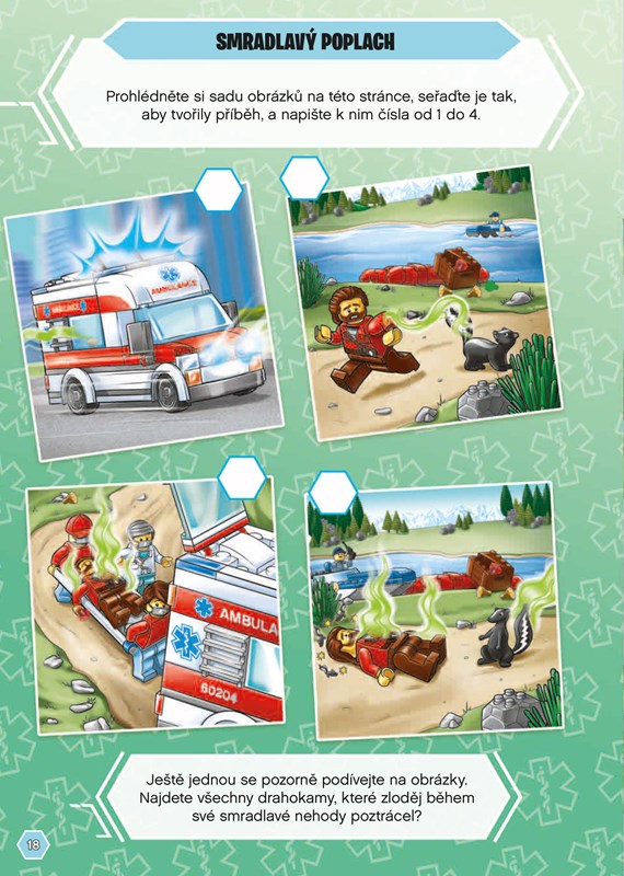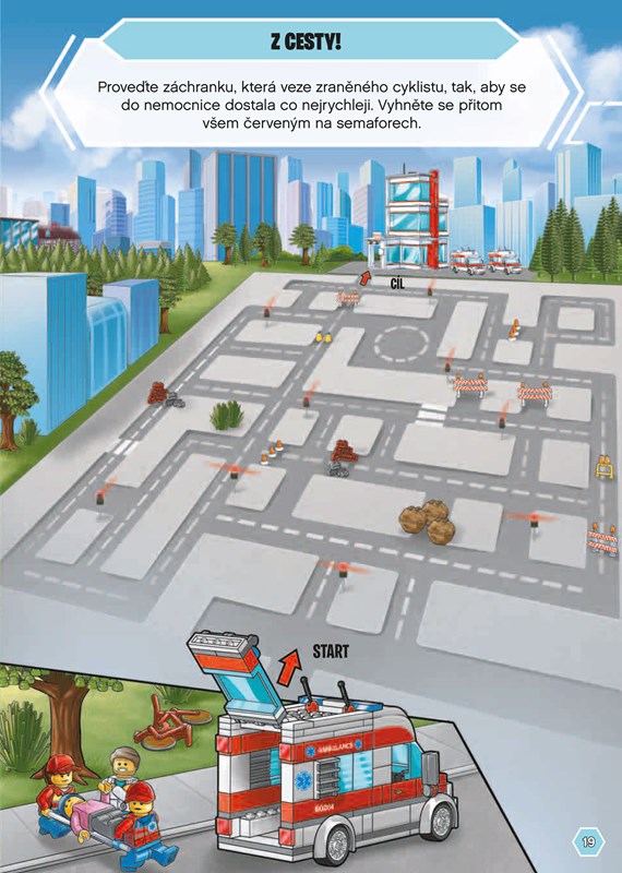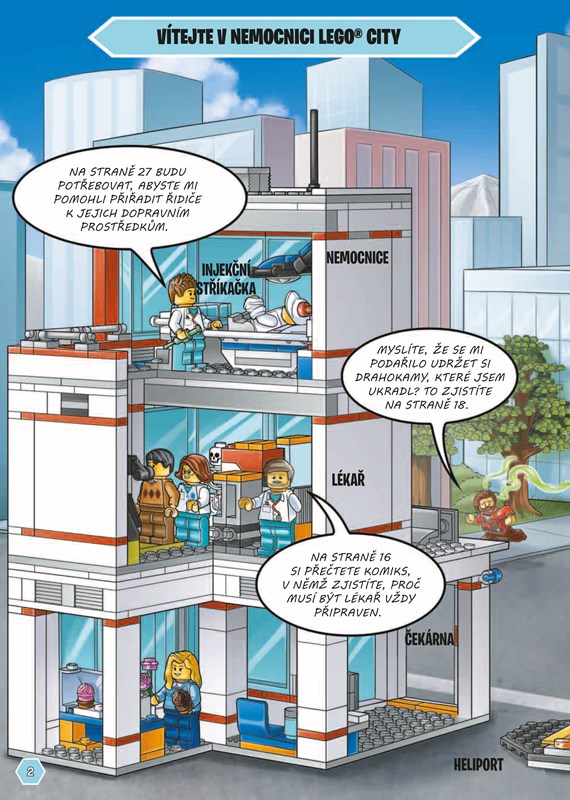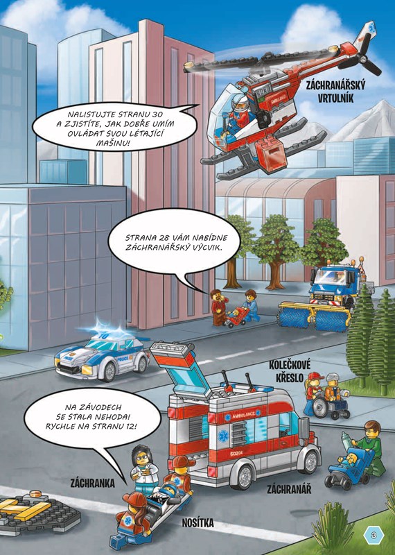 Každý den udržuje skupina hrdinů ve městě LEGO® City pořádek a bezpečí. Tito stateční mužové a ženy jezdí v sanitkách, policejních autech a létají v helikoptérách. Přečti si o jejich zábavných historkách, zasměj se u komiksu a vyřeš hlavolamy a úkoly. Nezapomeň si také sestavit minifigurku záchranáře. Na kopcích či v ulicích města – pomoc je už na cestě!
