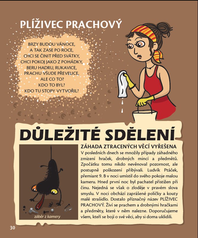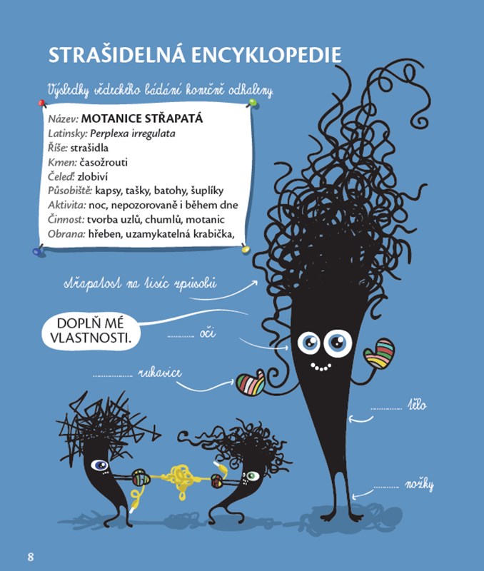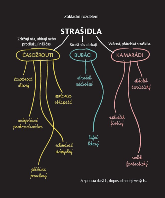 Časožrout obecný, motanice střapatá, strašák zádveřní, skřítek turistický, našeptávač prokrastinátor, bafač lekavý, schovávač důmyslný, plíživec prachový, snílek fantastický, zpěváček fintivý… Už se vám někdy stalo, že jste zahlédli v rohu místnosti podivný stín, v lese jste zaslechli záhadný zvuk, který nepatřil žádnému známému zvířeti, v prachu pod gaučem jste zahlédli neznámé stopy? Anebo vám znepříjemnily den zamotaná sluchátka nebo ztracené klíče? Tak to jste nejspíš měli tu čest, že si vás vybralo jedno ze známých nebo zatím neznámých strašidel. Ale nebojte, strašidla nejsou tak zlá, jak se o nich povídá. Dokonce je možné se s nimi skamarádit nebo (s trochou snahy) chytře vyzrát na ta zlobivá.