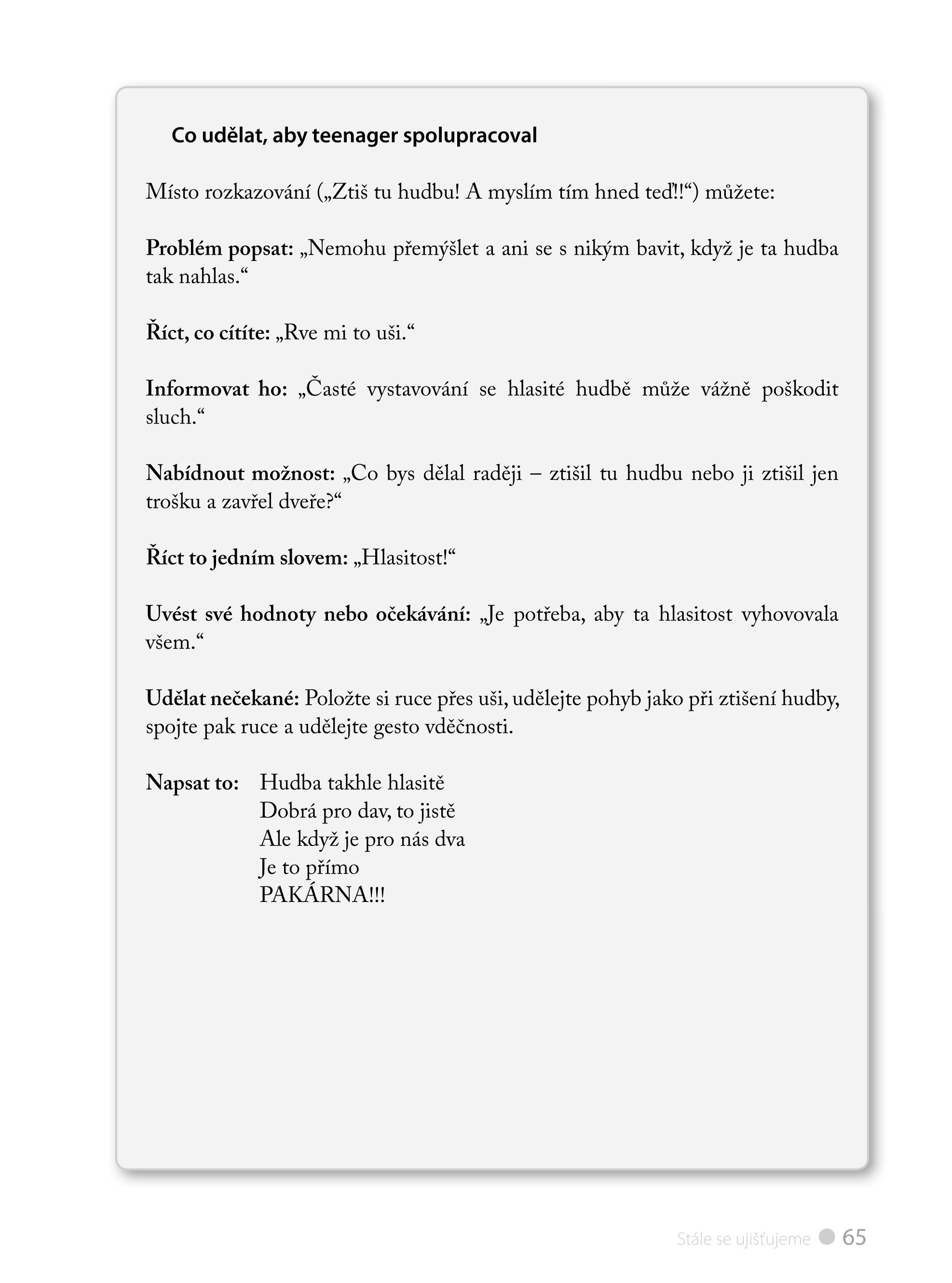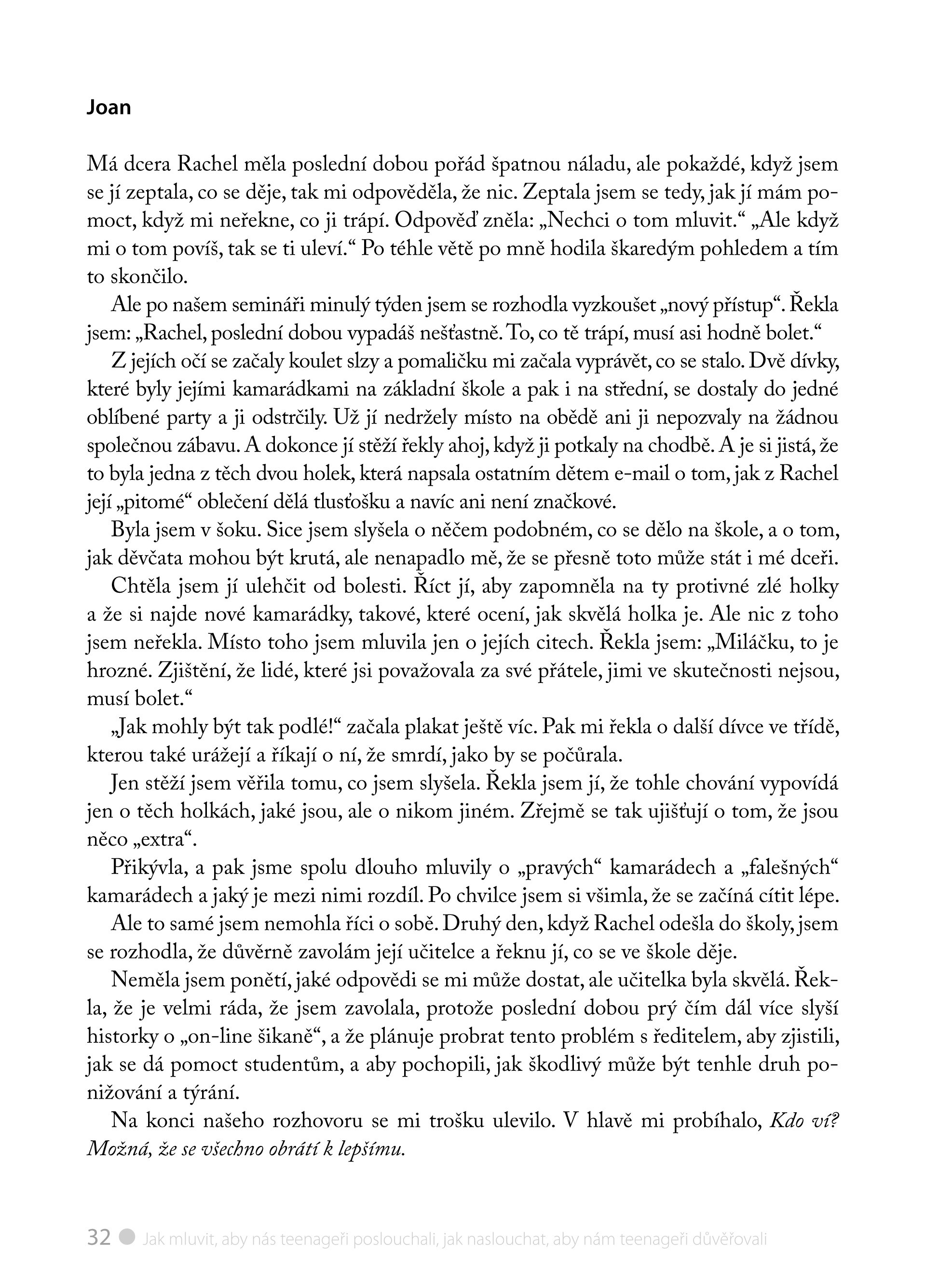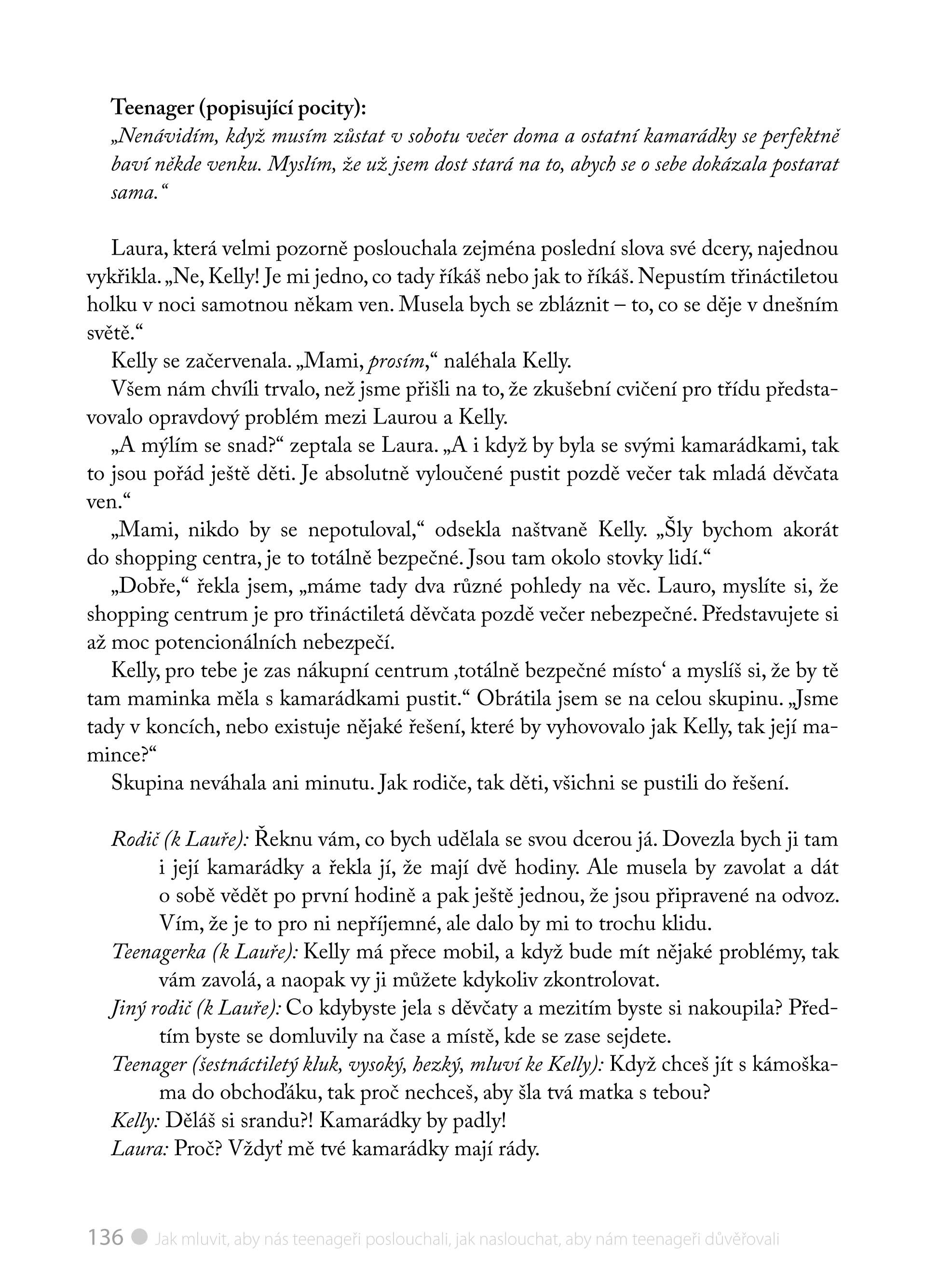 Světový bestseller. Názorný, srozumitelný a velmi čtivý návod jak vycházet s teenagery. Název přesně vystihuje obsah knihy. Ukázkové dialogy a situace řeší jak s teenagery mluvit, aby slova dospělých brali vážně, a poskytují rady jak teenagerům naslouchat, aby v dospělých viděli partnera, nikoliv nepřítele. Autorky využívají své zkušenosti ze seminářů s rodiči a jejich dospívajícími dětmi.