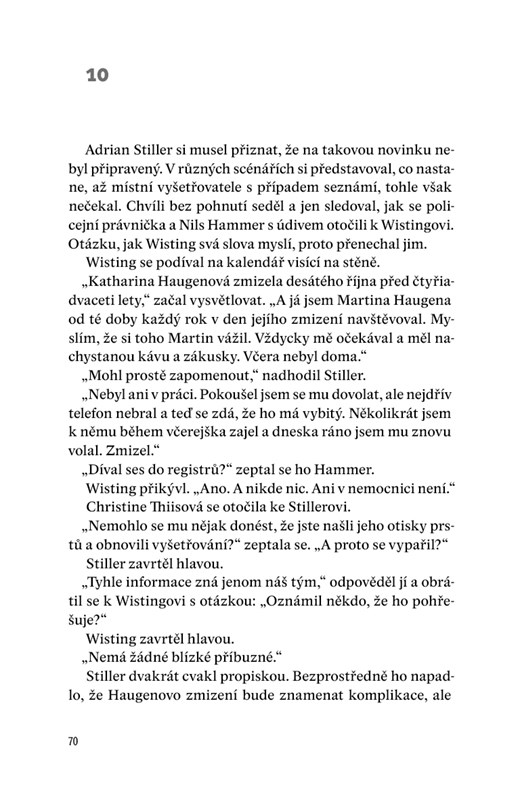 William Wisting jako každý rok přijíždí k domu Martina Haugena, odkud před čtyřiadvaceti lety beze stopy zmizela Haugenova manželka Katharina. Zůstal po ní jen papírek se záhadnými číslicemi a sbalený kufr. Případ se nikdy nepodařilo vyřešit – Katharina se nenašla živá ani mrtvá, Martin Haugen měl solidní alibi a ani jiné stopy nikam nevedly. Vztah mezi Wistingem a Haugenem se během dlouhého vyšetřování vyvinul v přátelství, a tak Wisting Haugena v den Katharinina zmizení vždycky navštěvuje. Jenže tentokrát nikdo neotevírá, dům je zamčený a Haugenův telefon mlčí. Téhož dne navštíví Wistinga na stanici mladší kolega, kriminalista Adrian Stiller z Kriposu, který má na starosti vyšetřování policejních pomníčků a přichází proto, že případ Kathariny Haugenové souvisí s jiným podivným zmizením. Přestože si oba vyšetřovatelé příliš nepadnou do oka, nezbývá jim než spolupracovat a pokusit se obě záhady vyřešit.