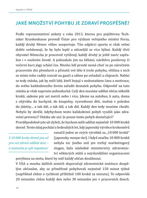 Objevte kouzlo 10 000 kroků. Právě tolik je potřeba denně ujít, abyste si udrželi či upevnili zdraví a formu. V dnešní zrychlené době, kdy na nic není čas, je chůze nejdostupnější způsob pohybu. Chodit se dá kdekoliv, kdykoliv a v jakémkoliv oblečení. Podstatný však je způsob chůze. Dobrá zpráva je, že správně chodit se naučí každý – i absolutní nesportovci.