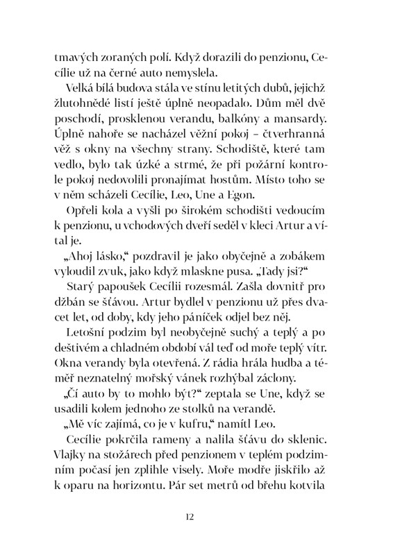 Po vlně chladného podzimního počasí se do Škunerové zátoky vrátily nezvykle teplé a slunečné dny. Pravé babí léto. Cecílie, Leo a Une najdou noviny, ze kterých kdosi vystříhal písmena i celá slova. Vyjde najevo, že v titulcích chybí mimo jiné výrazy jako „miliony“ a „smrt“. Ukáže se, že jde o vyděračský dopis a že policie má zůstat mimo hru. Najít odesílatele bude tudíž úkol pro naše odvážné kamarády. A na to, že se osoba, která slova z novin vystříhala a slepila z nich dopis, nachází ve Škunerové zátoce, ukazuje více stop. Penzion Perla je plný hostů, kteří sem přijeli na podzimní prázdniny, jedni zajímavější než druzí a mnozí z nich mají co skrývat. U Kamenitého ostrůvku kotví záhadná plachetnice a v lese parkuje zaprášené auto se zakrvácenými hadry na zadním sedadle.