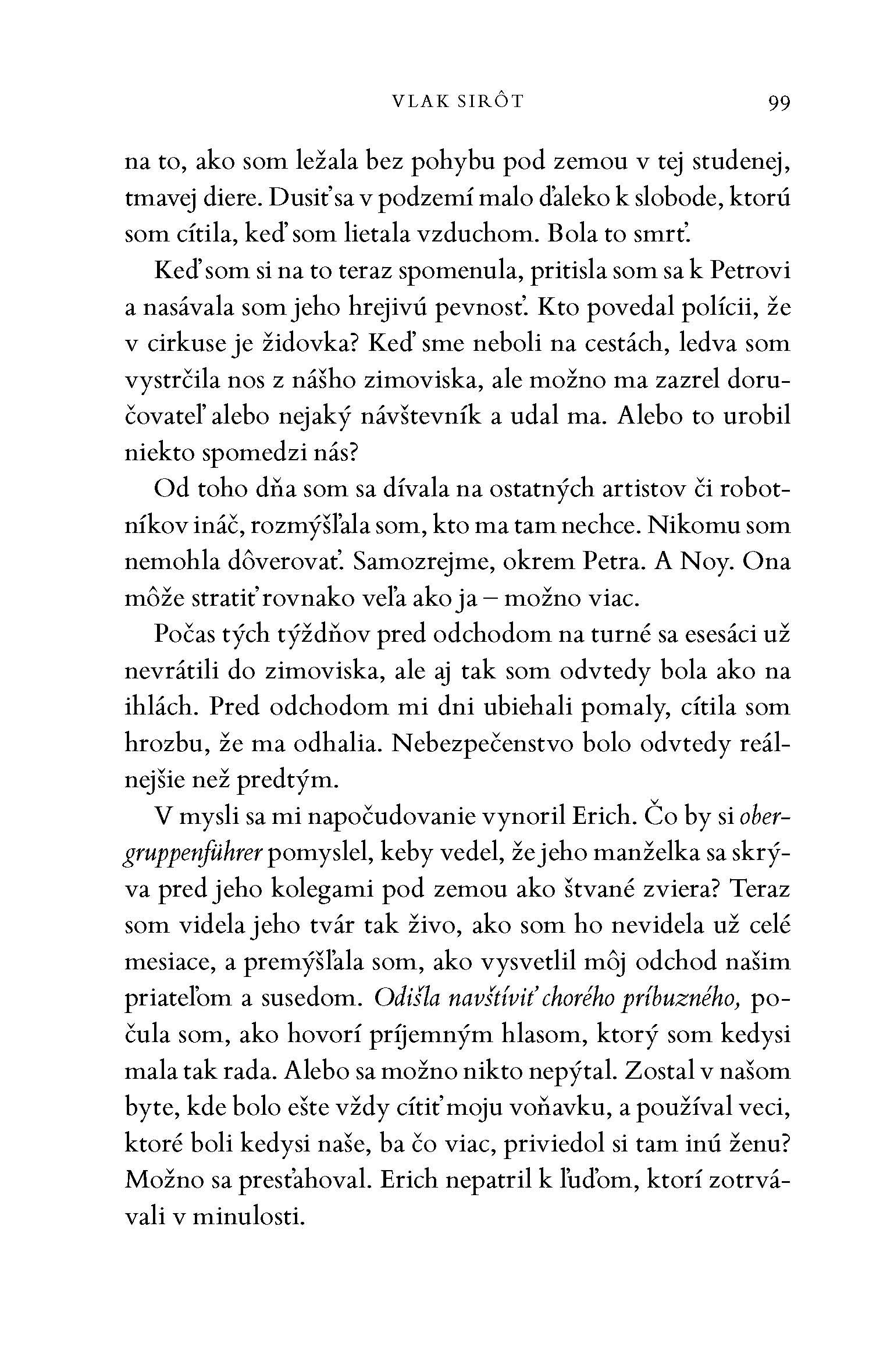 Musím sa priznať, že obálka knihy vo mne evokovala iný príbeh. Neviem aký, ale iný. Rýchlo som sa však preladila na ten, ktorý som čítala. V prvom momente som si povedala, že cirkusové prostredie nebude nič pre mňa. Opak bol pravdou. Cez tento príbeh môže čitateľ nazrieť, čo všetko znamená rodinný cirkus. Tvrdé každodenné tréningy, naplánovanie turné a celý presun cirkusu. O čo ťažšie to muselo byť počas vojny a obzvlášť, keď medzi účinkujúcimi bola židovka.
