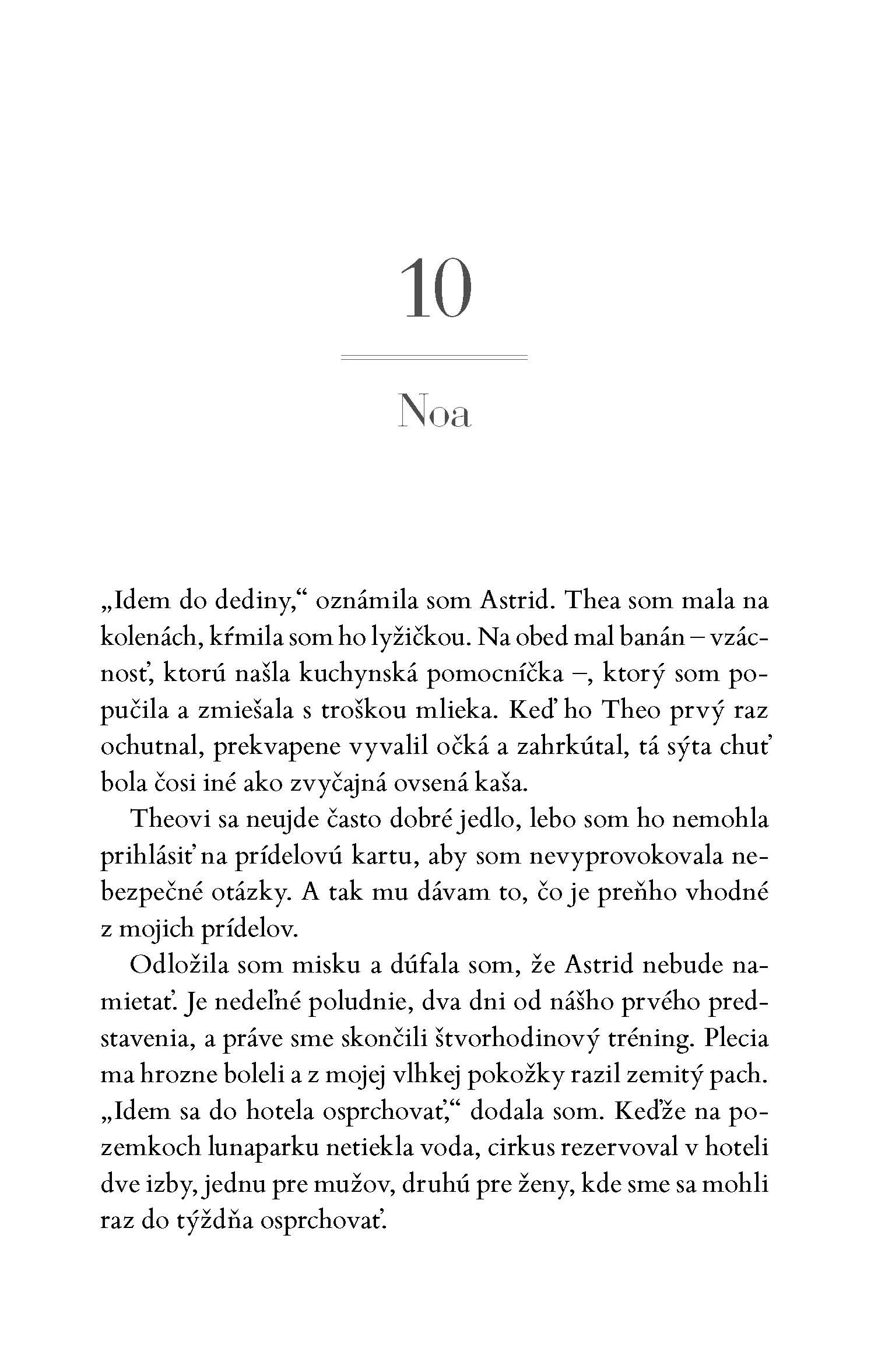 V knihe sa strieda rozprávanie dvoch postáv. Židovky Astrid a Holanďanky menom Noa. Astrid pochádza zo známej cirkusantskej rodiny. Vydala sa za nemeckého dôstojníka a žila s ním v Berlíne. Prišlo však nariadenie, že nemecký dôstojník nemôže mať za manželku židovku a tak sa Astrid vrátila domov. Ten však už nemala. Ich dom okupovali Nemci a netušila, kde je jej rodina. Prichýlil ju Herr Neuhoff. Kedysi konkurenčný cirkus. Astrid nemala na výber a aj keď mala pocit, že zrádza svoju rodinu, stala sa opäť artistkou.