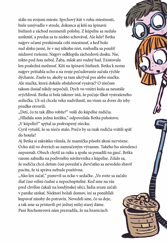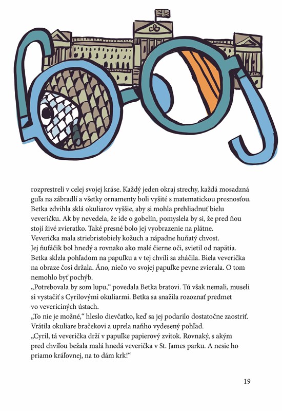Betka a Cyril sú súrodenci a spolu s rodičmi trávia dovolenku v Londýne. Pohybujú sa v priestore známeho parku St. James, v blízkosti Buckinghamského paláca a v príbehu sa dostanú aj do tmavých londýnskych ulíc, pivníc londýnskych škôl a spoznajú aj útroby záhadného hotela. Mašlejová dovolí čitateľom nahliadnuť aj do spálne jeho veličenstva – kráľovnej, čo iste nie je len tak umožnené obyčajnému smrteľníkovi. Betka je staršia a na rozdiel od svojho brata Cyrila vždy vycíti nejakú záhadu. Cyril je pokojnejší, ale aj ustráchanejší. Kedysi bol závislý na počítačových hrách a na internete. V parku objavia veveričky, ktoré ich spolu so zvláštnym obrazom z hotela, privedú na stopu veľkej katastrofy. Rozhoduje sa o záchrane celého sveta a pomôcť môžu iba odvážni súrodenci. Betka s Cyrilom nakoniec preukážu nielen odvahu, ale aj bystrosť a veľké srdce.