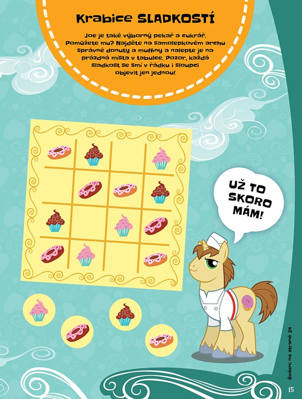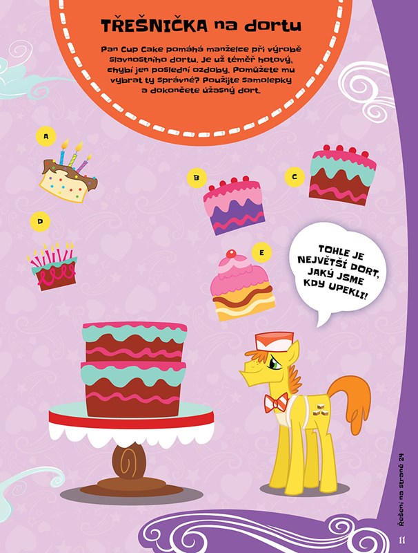 Právě držíte v rukou novou knihu plnou zábavných úkolů, které vás zavedou do kouzelného světa oblíbených poníků. Seznamte se s paní Cup Cakeovou a její rodinou a pomozte jim zvládnout každodenní úkoly. Vybarvujte, řešte hlavolamy a bavte se při zdobení stránek samolepkami!