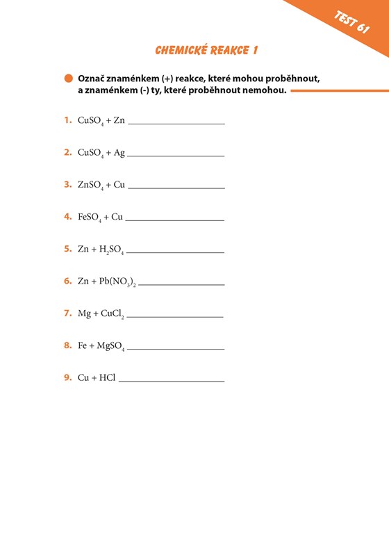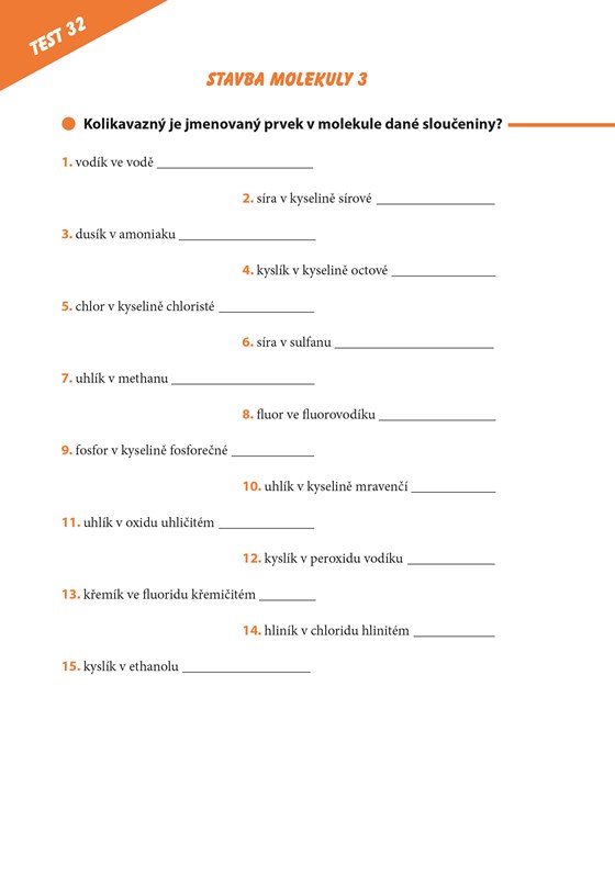 S tím vším by vám měla pomoci tato publikace. Stačí si vytrhnout některý z pracovních listů, vyřešit cvičení a pak si jednoduše zkontrolovat správnost řešení. Začnete nejvíce používanými značkami, budete pokračovat přes dvouprvkové sloučeniny až k racionálním vzorcům organických sloučenin. Nevynecháte nepopulární rovnice, ale pobavíte se u testu ze znalostí o nejznámějších vědcích z oblasti chemie.