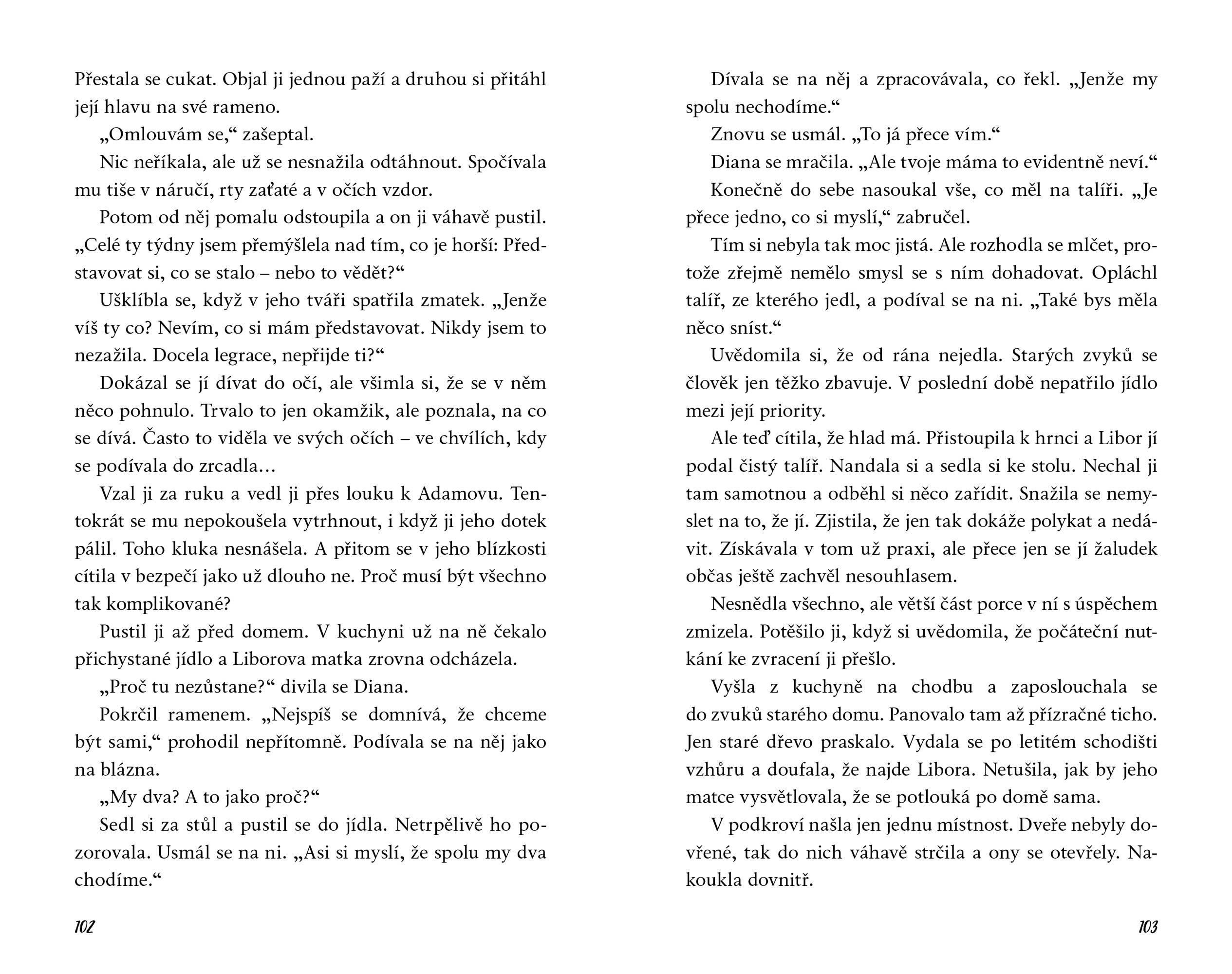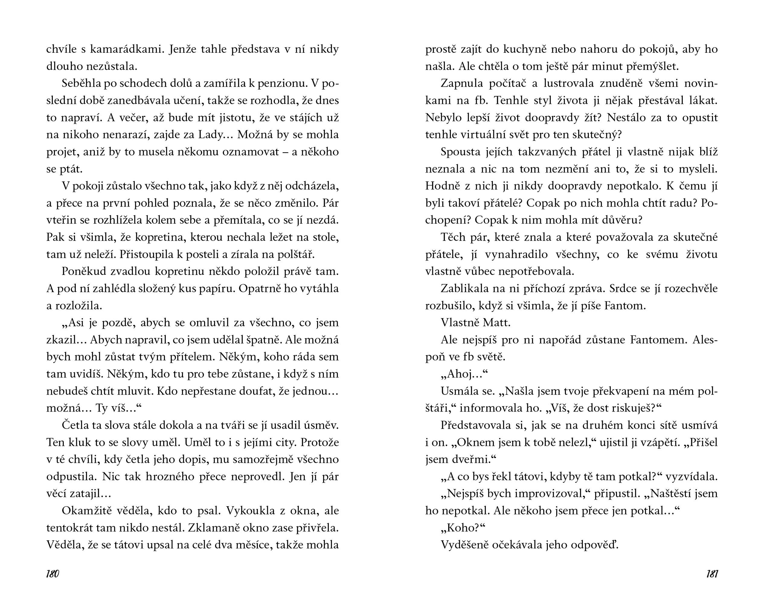 Diana se po dvouměsíčním pobytu v sanatoriu vrací na ranč U Sedmi strak, ale má dojem, že tam nikoho nepoznává. Nejděsivější je, že nepoznává ani sama sebe. Její život, jak ho znala, nadobro skončil. Jak se má vyrovnat s tím, že o všechno přišla? Má vůbec cenu snažit se najít nový smysl života? Pomůže jí v tom Libor, kterého táta přijal na výpomoc ve stájích, či tajemný Fantom, který jí píše na Facebooku? Možná tu trpkou prázdnotu vyplní brigádník Matt, v jehož něžných očích by se dokázala utopit… Může ale někomu z nich skutečně důvěřovat? A dokáže ještě vůbec důvěřovat sama sobě?