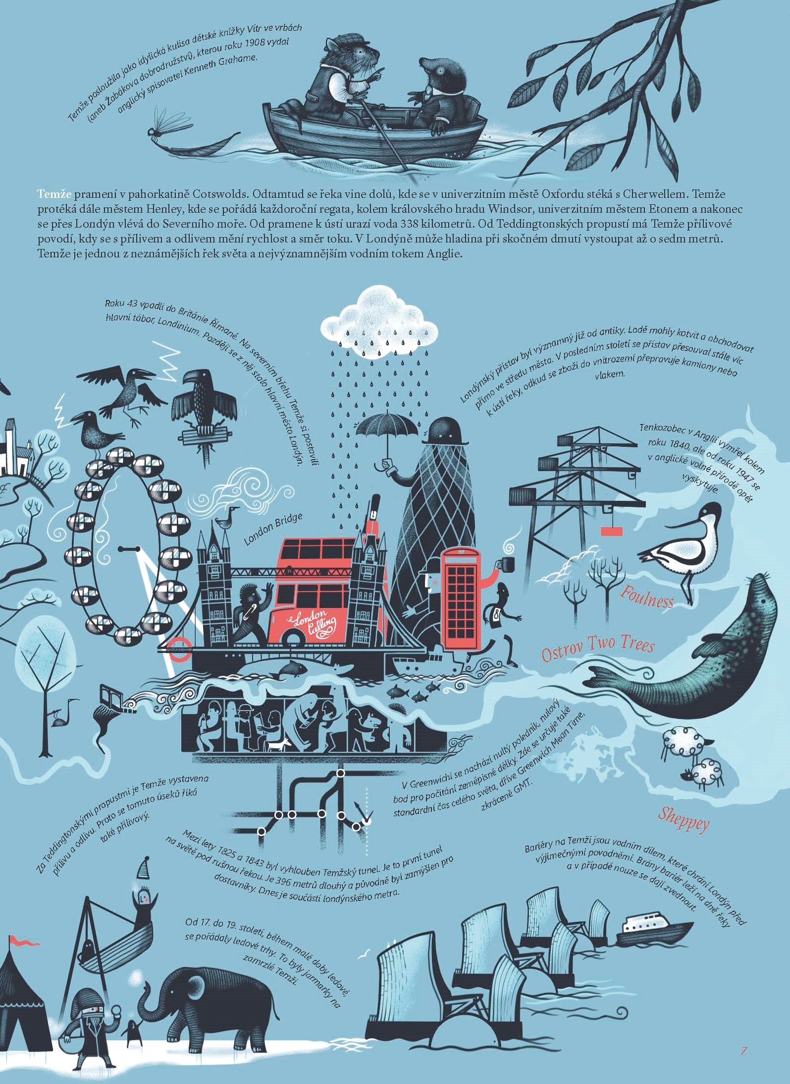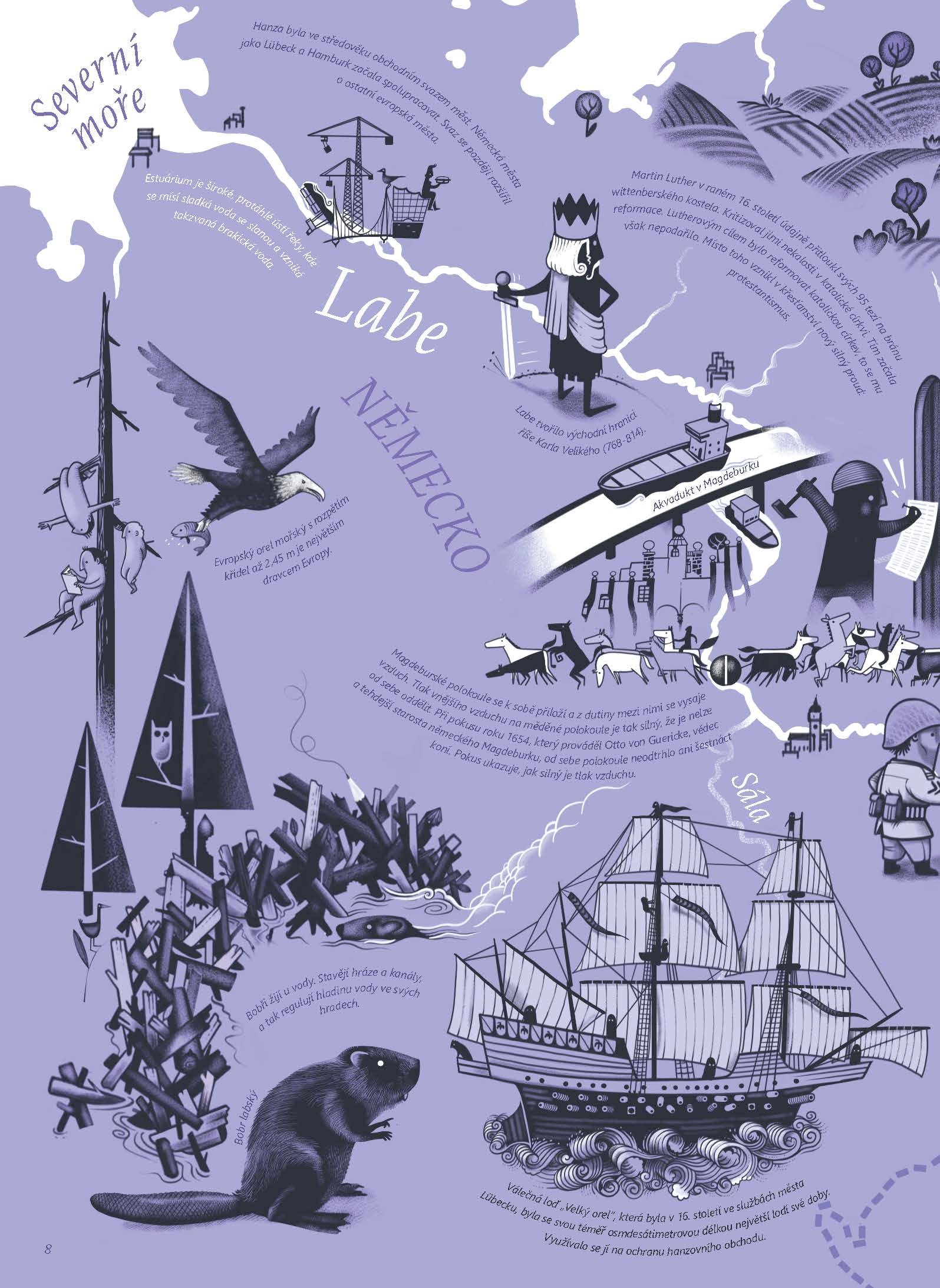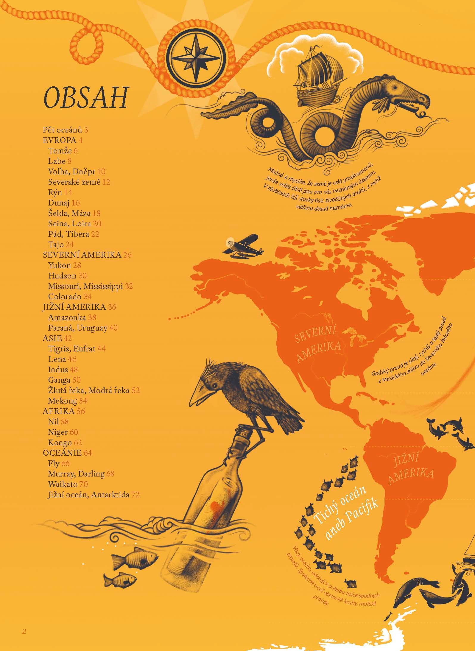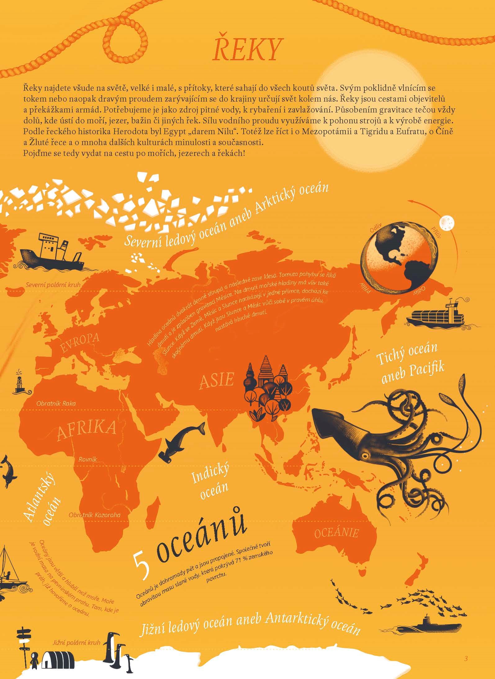 Graficky poutavá kniha belgického ilustrátora Petera Goese čtenáře provede vodstvem Evropy, Severní a Jižní Ameriky, Asie i Afriky. Kniha přináší na osmdesáti stranách spoustu faktografických údajů, ale v tak zajímavé podobě, že nepostřehnete, že čtete fakta. Při cestě vás budou doprovázet vodní živočichové, kteří život řek, jezer a oceánů dělají tolik rozmanitý.