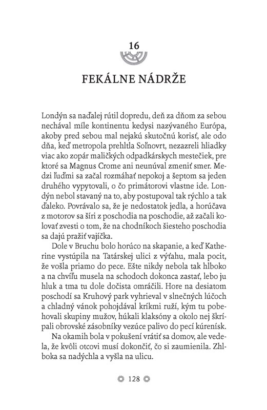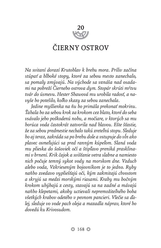 Jednoznačne sa mi najviac na knihe páčilo to chladné steampunkové prostredie. Na každej stránke bola cítiť úplne úžasná atmosféra, ktorá len svedčí o tom, že autor dokáže úžasne vytvoriť prostredie a tým aj celú chladnú steampunkovú odyseu prebrať k životu tak, aby si ju čitateľ do sýta užil. Dielo má neskutočnú hĺbku, a komplexné postavy, pobaví vás aj to, že v sebe ukrýva odkaz na divadelnú hru od Williama Shakespeara Othello. Avšak jednoznačne najlepšie vykreslená bola postava mechanického vraha Krutohlava, ktorého príbeh dojme nejedného čitateľa. Od knihy som zo začiatku nečakal veľa, pretože sa navôkol nej urobila jedna veľká reklamná bublina a film, po pravde, fanúšikov Philipa Reeva neohúril. Ostal som však príjemne prekvapený, pretože univerzum, do ktorého s hlavnými postavami vstupujeme, je premyslené od prvej súčiastky po spoločensko-politické zázemie, s ktorým musia jednotlivé postavy bojovať. Jediné mínus, ktoré sa tu predsa len nájde, sa nieslo v podobe predvídateľnosti príbehu. Ten bol taký trochu priamočiary, a to napriek tomu, že sa hlavne vo vzťahoch začal nepekne zamotávať. To, že som ako čitateľ vedel, ako sa bude príbeh ďalej vyvíjať a že sa skutočne nedostaví žiadny zvrat, ktorý by ho niečím okorenil, kazilo trochu dojem z knihy, ktorá mohla byť takmer dokonalá!