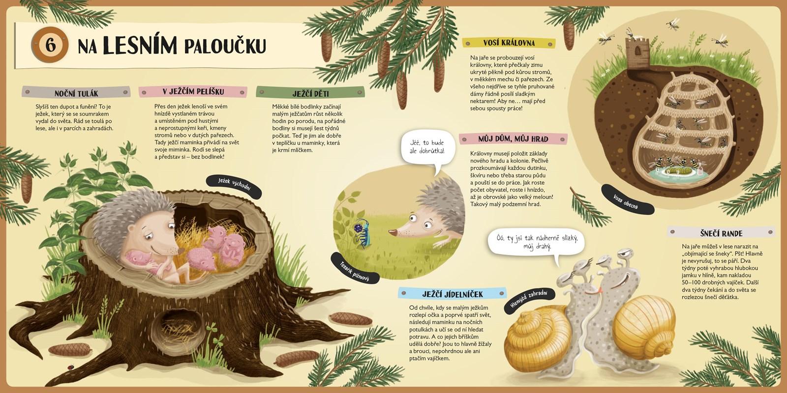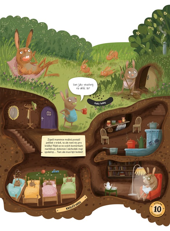 Víte, že rezatá liška je velká nepořádnice a že jezevec je jedno z nejčistotnějších zvířátek, které má dokonce svůj vlastní záchodek? Přesto jsou to sousedi, kteří se často dělí o jednu noru. Nevěříte? Tak s námi pojďte nahlédnout do jejich tajemných domečků a komůrek skrytých pod pařezy a vývraty v hloubce i několika metrů pod povrchem… Budeme se prodírat podzemními labyrinty a navštívíme veselou králičí rodinku, ale třeba i ospalé medvědy v jejich jeskynním pelíšku a nezbedné malé hranostaje v noře zděděné po myškách. Z nádherně ilustrované encyklopedie, která je součástí knihy, se dozvíte další zajímavosti z říše zvířat – například že i obávaný a neohrožený medvěd grizzly se jednomu malému zvířátku raději vyhne obloukem… Tak na co ještě čekáte? Vzhůru do lesních brlohů a doupat!