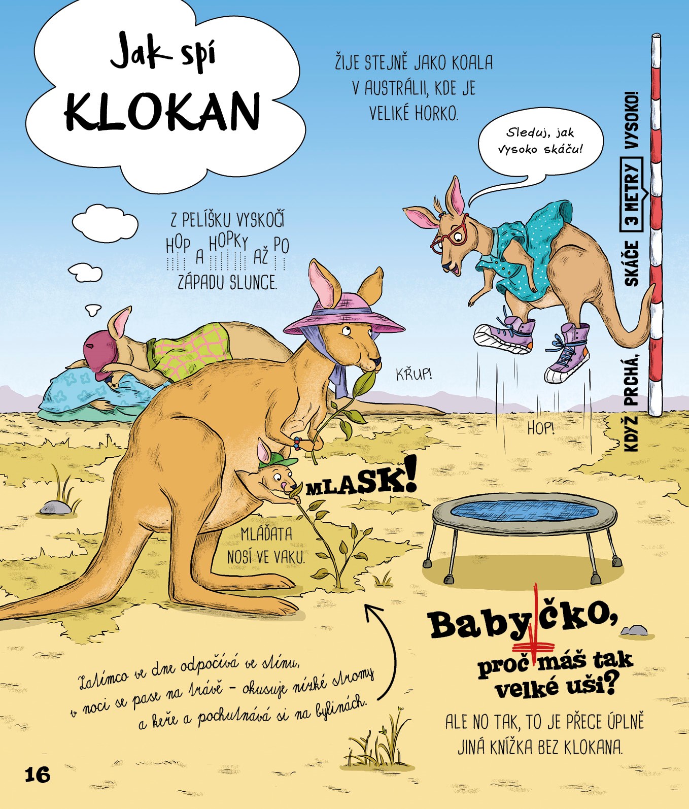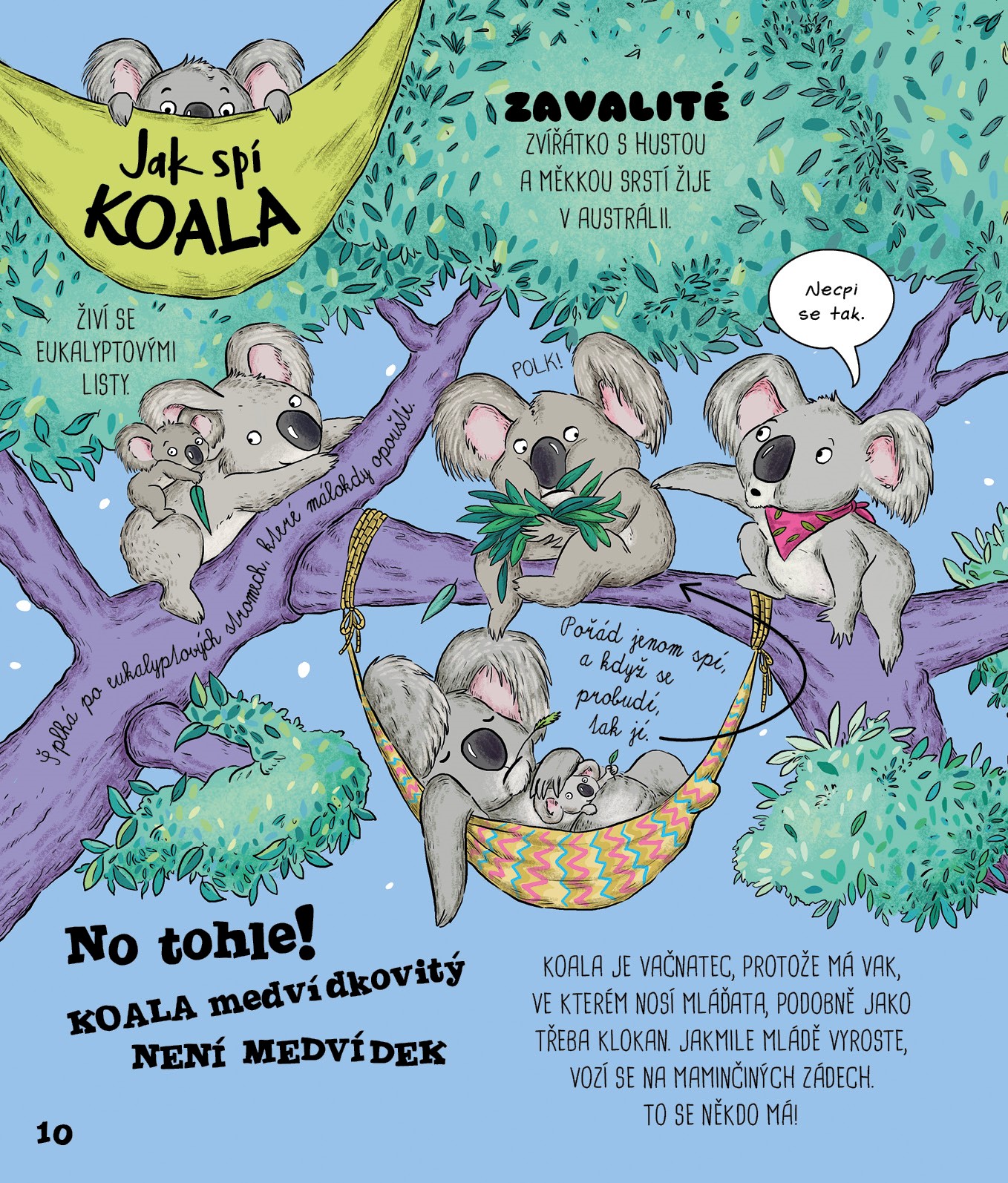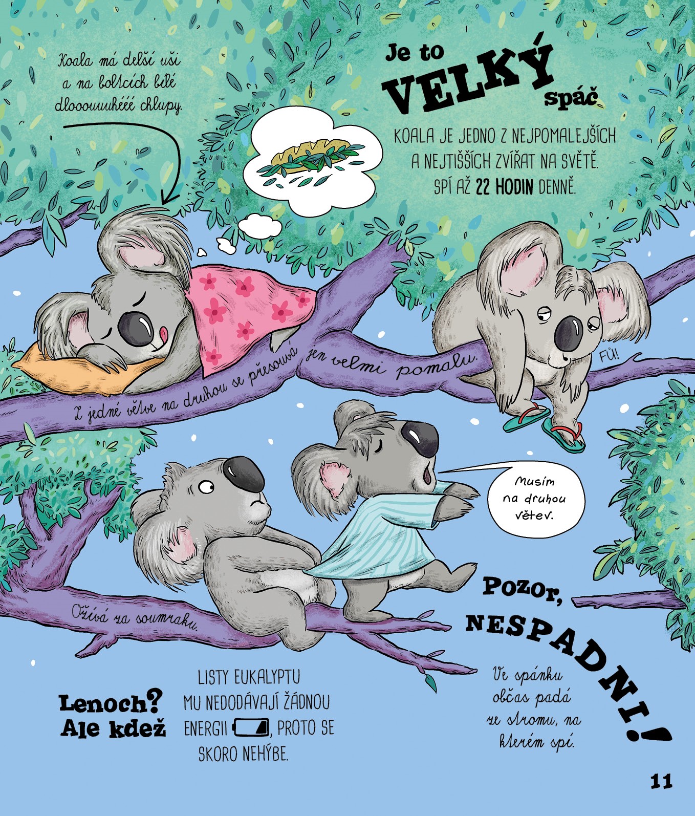 V noře, na stromě, hlavou dolů, hluboko pod vodou nebo za letu s jedním okem otevřeným. I zvířata musejí spát, aby nabrala sílu do nového dne, jenže způsob, jakým spí, se od toho lidského velmi liší. A délka spánku jakbysmet. Zatímco člověk je v peřinách zavrtaný jen osm hodin denně – a někdy ještě méně, některá zvířata spí, představ si to, až dvacet hodin v kuse! Například koala, která se v podstatě prospí životem a odpočívá na větvi stromu jako na lehátku…