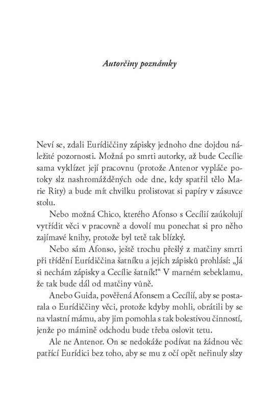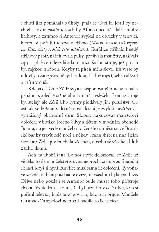 Eurídice by se v životě ráda prosadila, ale všechny jejich snahy jsou už předem odsouzeny k neúspěchu. Její tradičně smýšlející manžel není na nezávislou ženu zvědavý. Hlavně ať jsou pantofle podélně srovnané u paty postele a rádio není nahlas ani potichu! Když se však u dveří objeví její zmizelá sestra Guida, životy všech se obrátí naruby. Debutový román, který vyšel ve dvaceti zemích, patří mezi to nejzajímavější ze současné světové literatury.