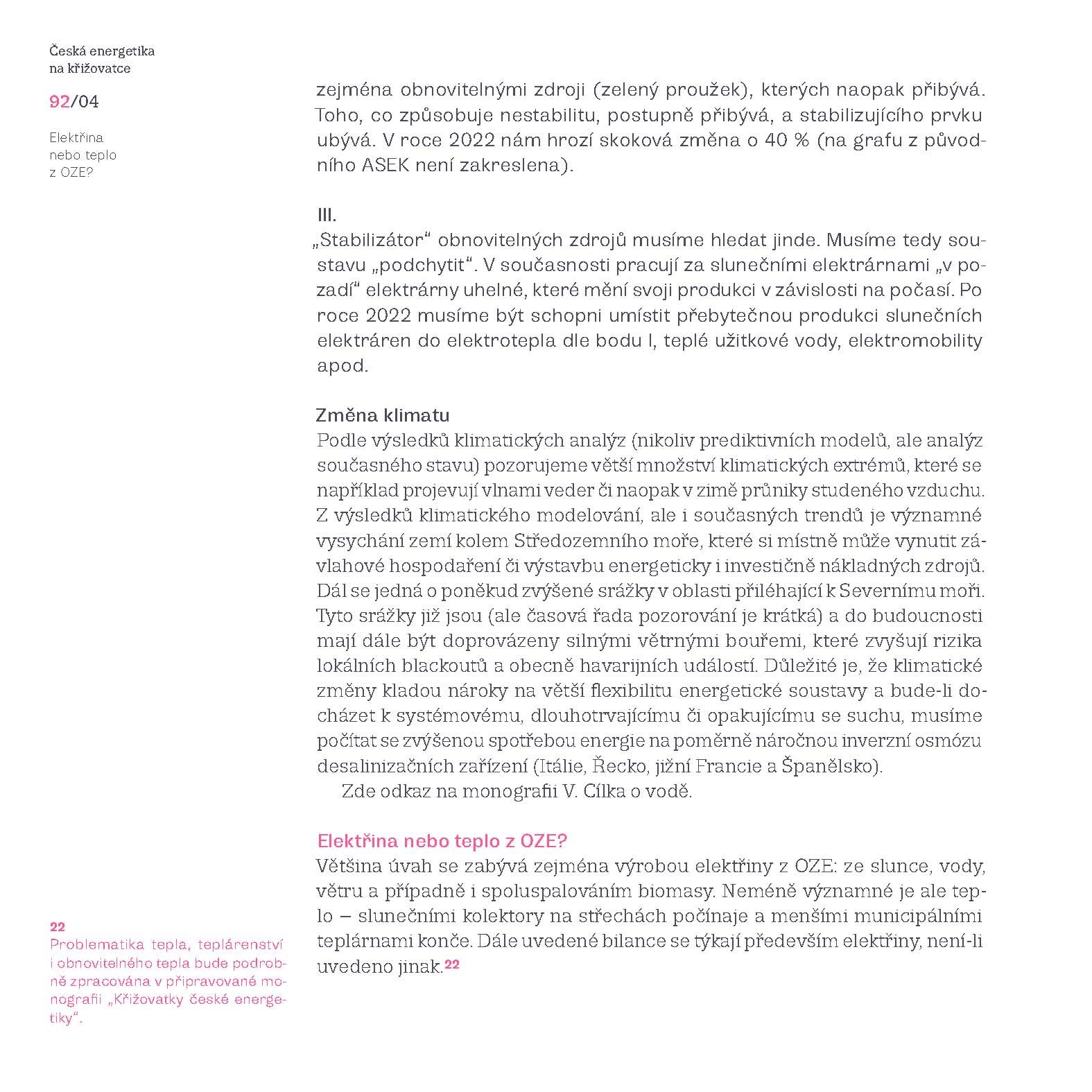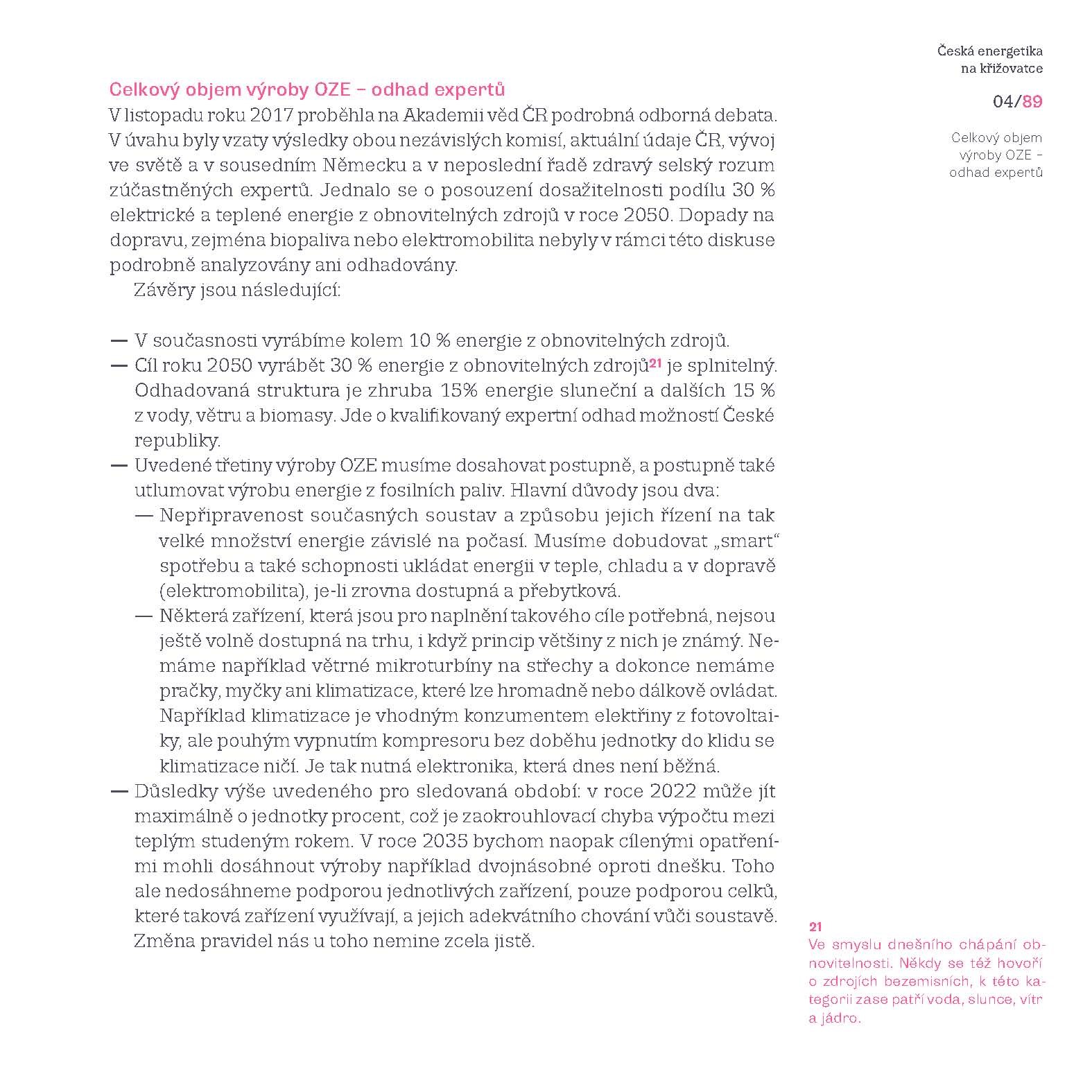 Česká energetika na křižovatce je pokračováním úspěšné publikace Perspektivy české energetiky z roku 2014. V první publikaci autoři popisují návrh další energetické politiky České republiky, který byl poté schválený vládou. V této knize nemění autoři své priority ani nenavrhují novou orientaci české energetiky, ale upozorňují na rizika, která vyplývají jednak z toho, že se schválený scénář rozvoje strategického oboru nerealizuje a jednak ze změn politických priorit v sousedních zemích i v EU. V první polovině dvacátých let, zejména v roce 2022, nás čekají převratné změny. V Německu se zavřou jaderné elektrárny a u nás to může být až 40% uhelných zdrojů. I v této situaci může mít Česká republika dostatek energie, pokud vezme rozum do hrsti. Při udržovaní stávajícího vyčkávajícího trendu nás ale mohou očekávat významná rizika, která jsou schopná ovlivnit nejenom samotnou energetiku, ale i celý český průmysl. Na druhé straně máme ale nové perspektivy rozvoje energetiky 21. století, které musí Česká republika reflektovat, nechce-li se stát během několika let státem bojujícím s možnými problémy v zajištění svých vlastních strategických energetických potřeb.