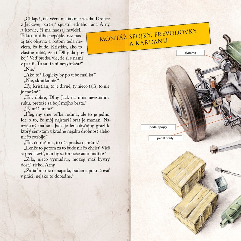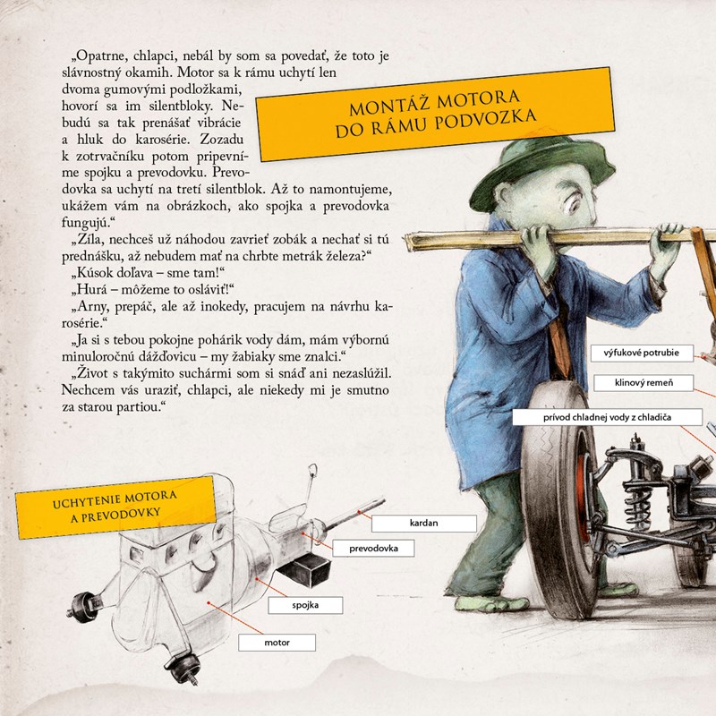 Dvaja kamaráti, potkan Arny a vrabčiak Zíla, sa rozhodnú, že si postavia auto. Získajú dôležitého spojenca, žabiaka Kristiána, ktorý má možnosť zaobstarať všetko potrebné, a práca sa môže veselo začať. Naši hrdinovia nie sú žiadni svätúšikovia a nepatria ani medzi hviezdy zvieracej ríše. Bývajú na okraji mesta medzi starými ohradami, autodielňou a veľkou skládkou. V tomto svete im bystrá hlava a ostrý jazyk rozhodne nie sú na škodu. Počas príbehu, keď Arny s kamarátmi musia pri stavbe auta prekonávať tisíce nečakaných prekážok, sa čitateľ dozvie, ako je zostrojený a ako funguje automobil. Z knihy je možné pochopiť princíp motora, spojky, bŕzd, rozdeľovača a mnoho ďalších vecí.