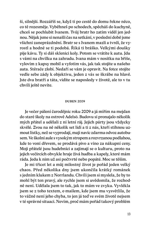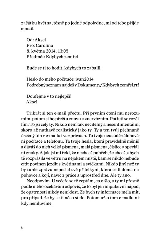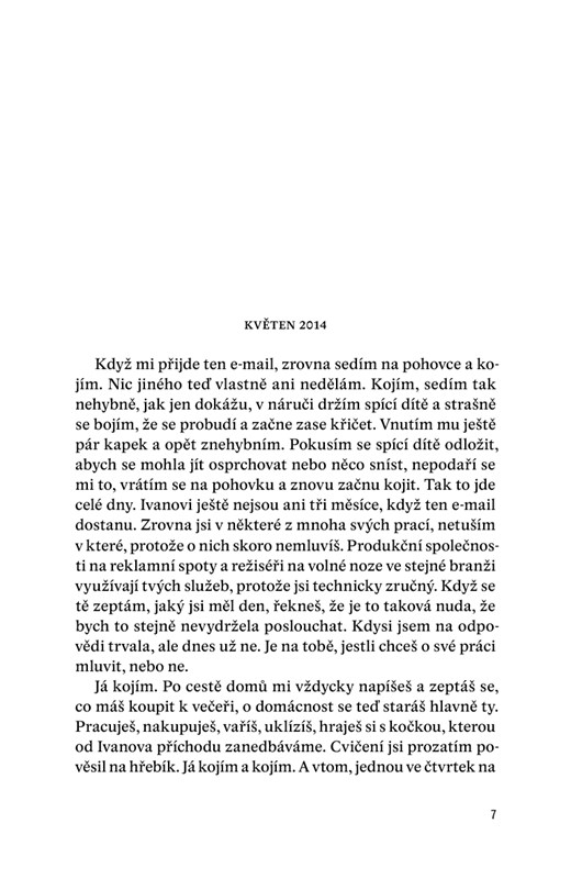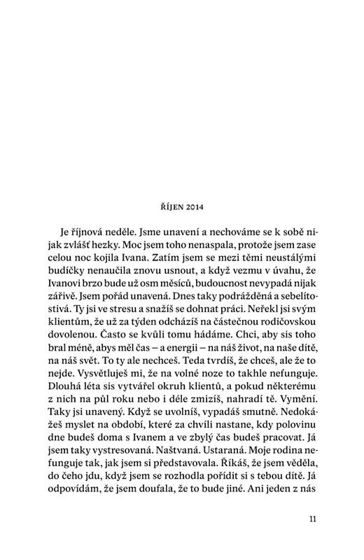 Když ti naposledy přeju dobrou noc, netuším, že to je opravdu naposledy. Kdybych něco tušila, nejspíš bych do našeho rozloučení vložila víc energie. Namísto toho ti oznamuju, že si asi brzy půjdu lehnout k Ivanovi. Neprotestuješ. S pohledem upřeným na obrazovku počítače mě necháš odejít. A já tedy odcházím. Domnívám se, že se uvidíme ráno. Není tomu tak. Neuvidíme se už nikdy.