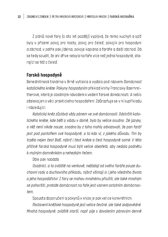 Tato kniha není jen prostou kuchařkou, tedy souborem receptů, ale je též knihou k poučení o církevním roku a jeho vlivu na jídelní zvyklosti předků, o životě farářů a farských hospodyň, a to obzvláště na venkovských fa¬rách, a též o sepětí tehdejšího jídelníčku s ročními obdobími a dostupnými místními surovinami. Zajímavou součástí je také kapitola věnovaná meš¬ním vínům a patronům vína.