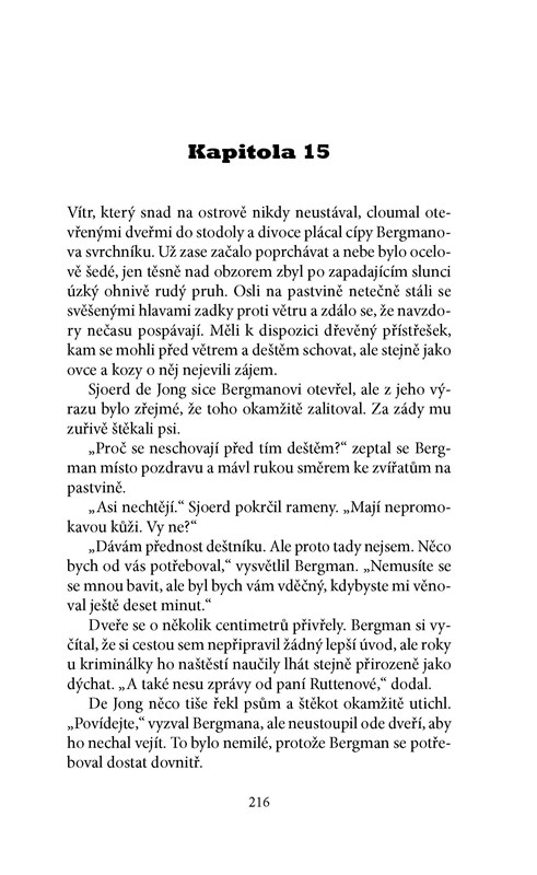 Smrt bohatého Johana Ruttena se mohla hodit více lidem. Například jeho české manželce, soudní překladatelce, která nyní zdědí veškerý jeho majetek... Na její popud přijíždí na ostrov kriminalista Josef Bergman. Chce na Schiermonnikoogu strávit dovolenou, vyčistit si hlavu od starostí a udělat důležité životní rozhodnutí. Jenže brzy je proti své vůli vtažen do složitého případu.