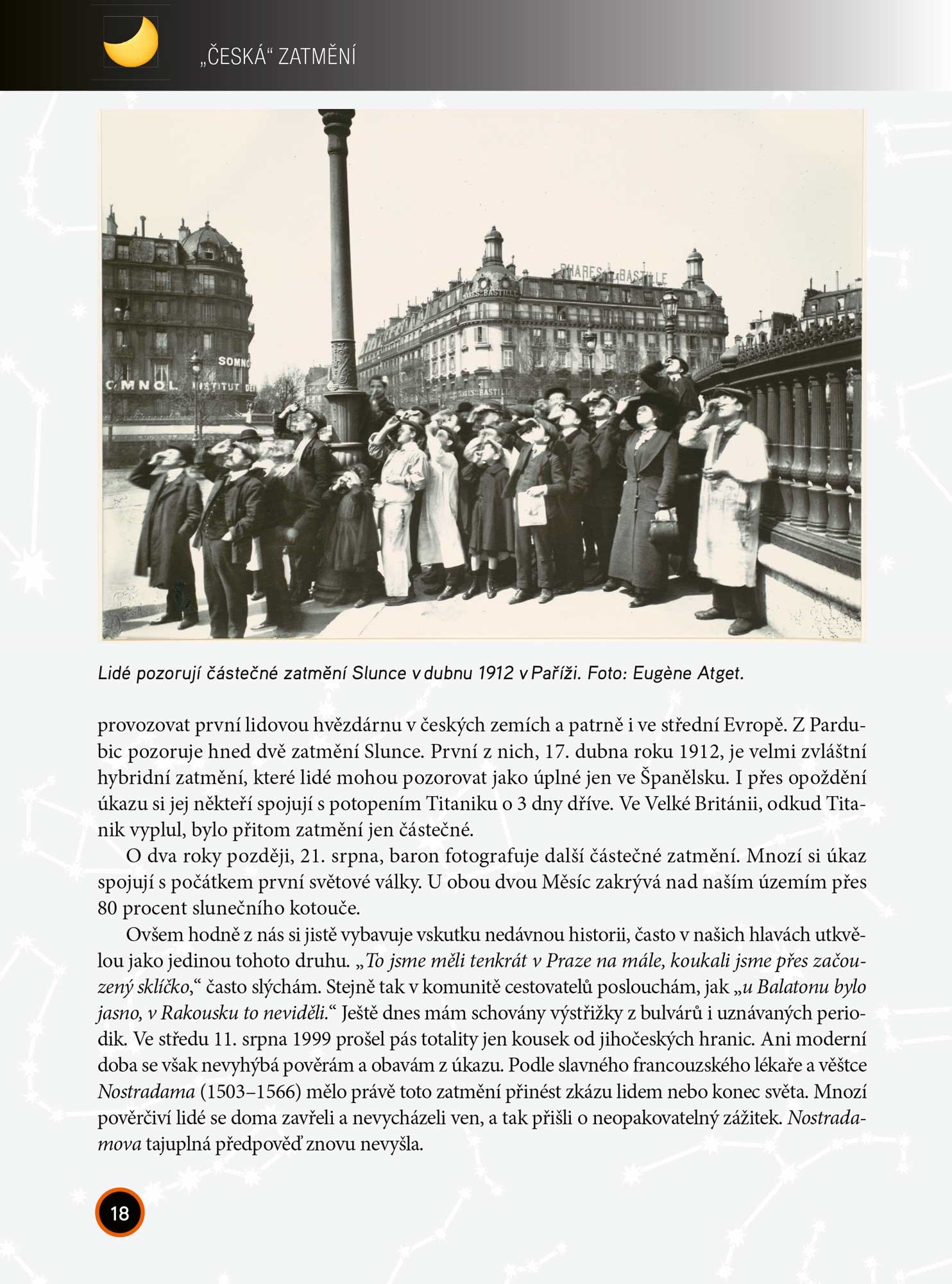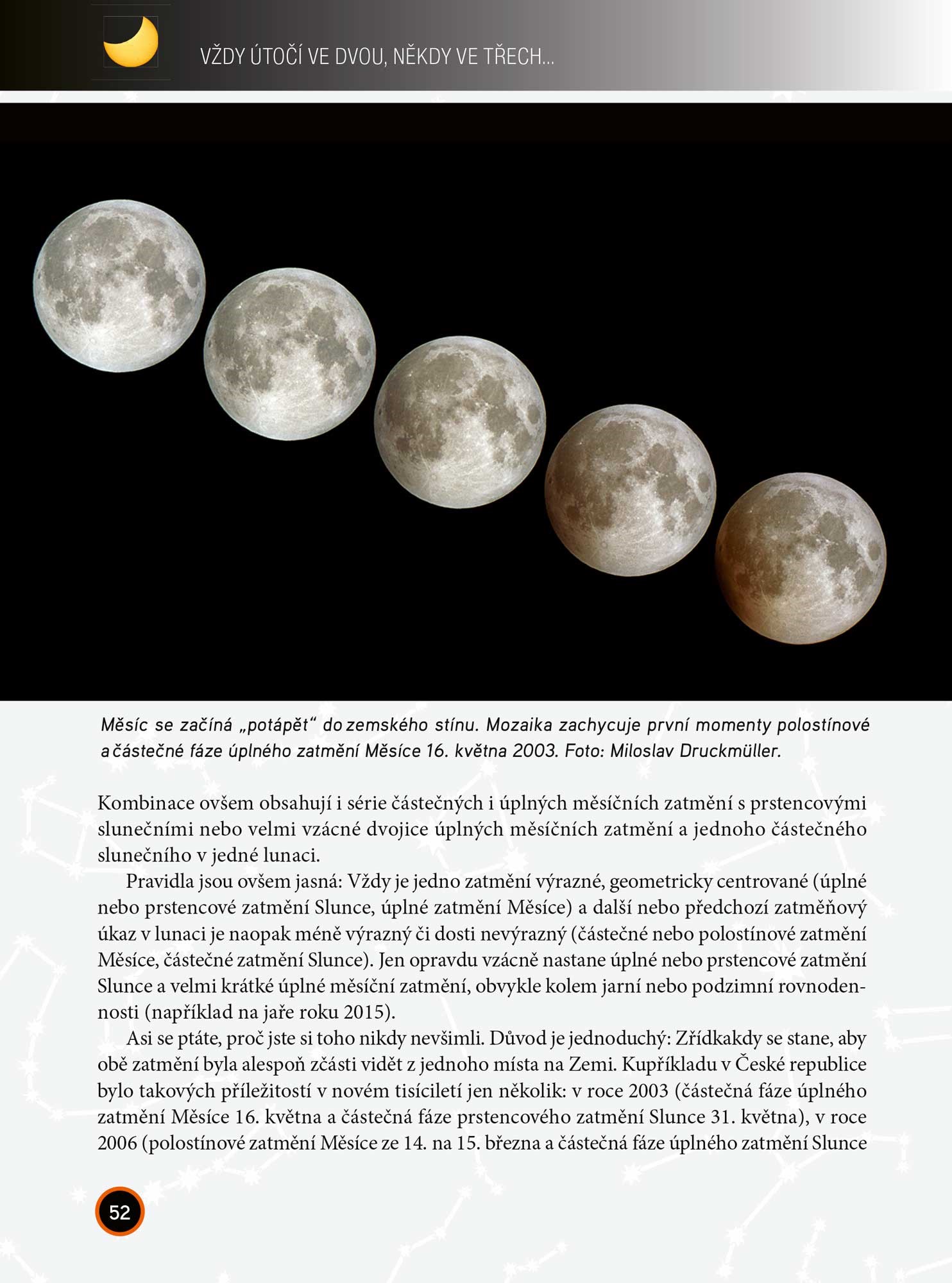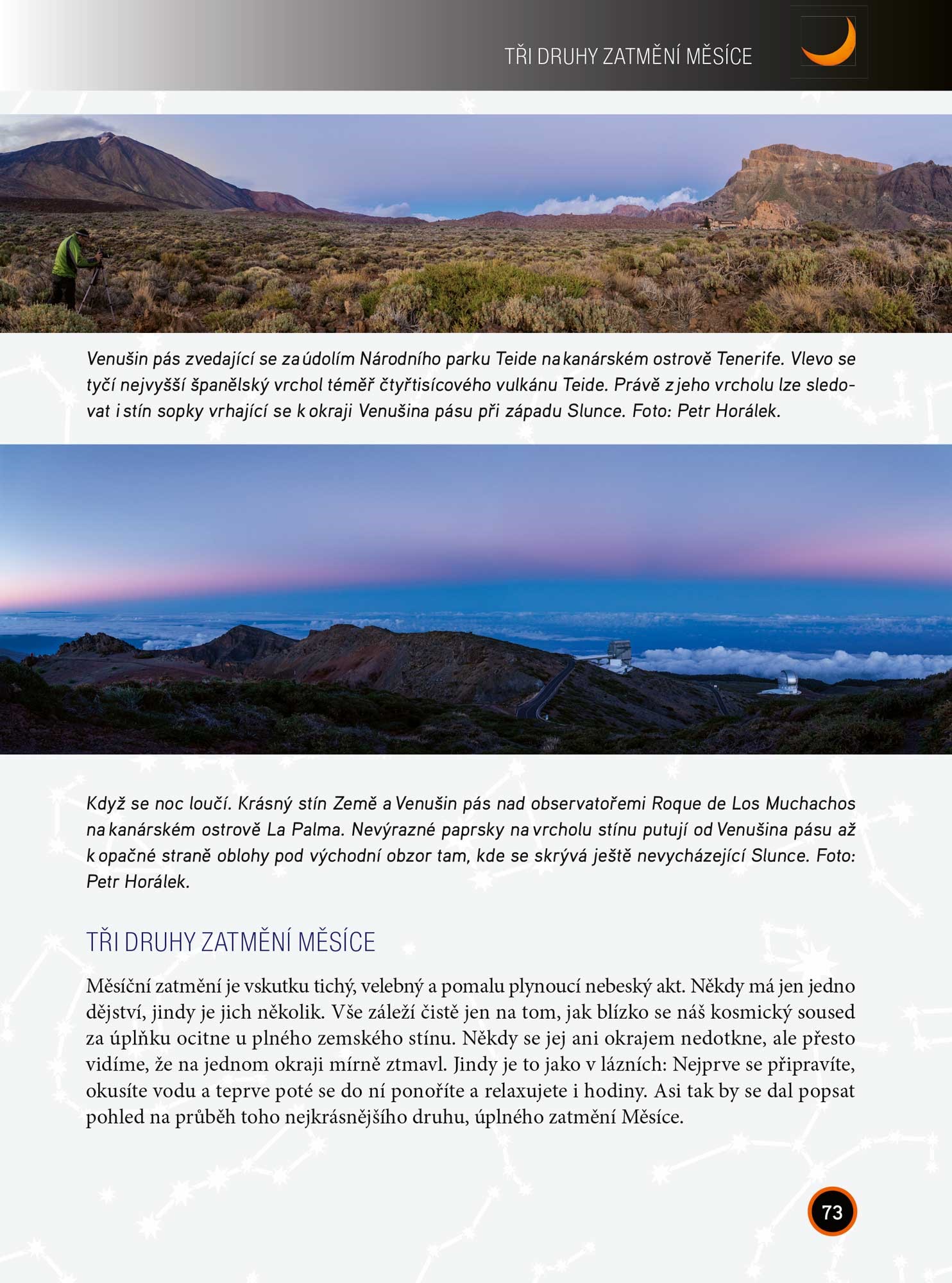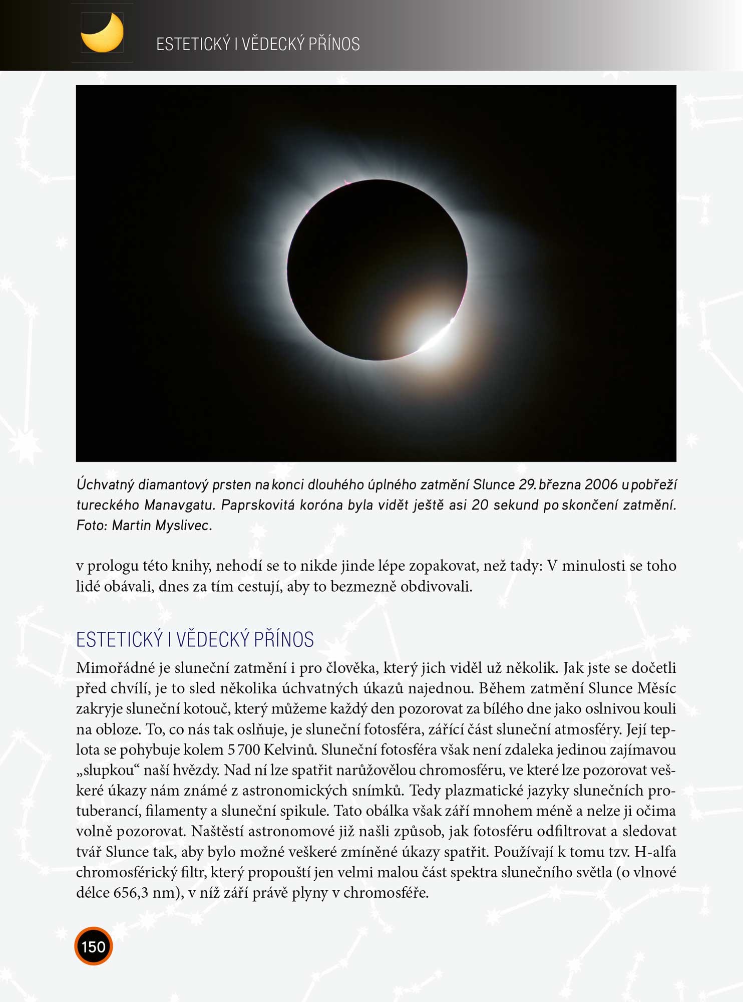 V minulosti se jich lidé obávali. Brali je jako zlá znamení. Doba se však změnila… Nové, doplněné vydání knihy známého fotografa hvězdné oblohy Petra Horálka bude vaším průvodcem po patrně nejkrásnějších a zároveň jedněch z nejvzácnějších úkazů na obloze – slunečních a měsíčních zatměních. Dozvíte se, jak bylo lidstvo od nepaměti fascinováno těmito jevy, poznáte historii pozorování i vědeckou současnost. Poznáte zákony, podle kterých se úkazy zatmění řídí a co z nich činí nezapomenutelné zážitky. Jedinečnost knihy podtrhují úžasné fotografie a cestovatelské vzpomínky autora, ve kterých popisuje dramatické i dojemné momenty z expedic za zatměními. Závěr knihy je pak unikátem – najdete zde zevrubný přehled všech zatmění viditelných z České republiky až do roku 2060 s bohatým obrazovým materiálem a pro fajnšmekry nechybí ani přehled nejvýznamnějších úkazů ve zbytku světa.