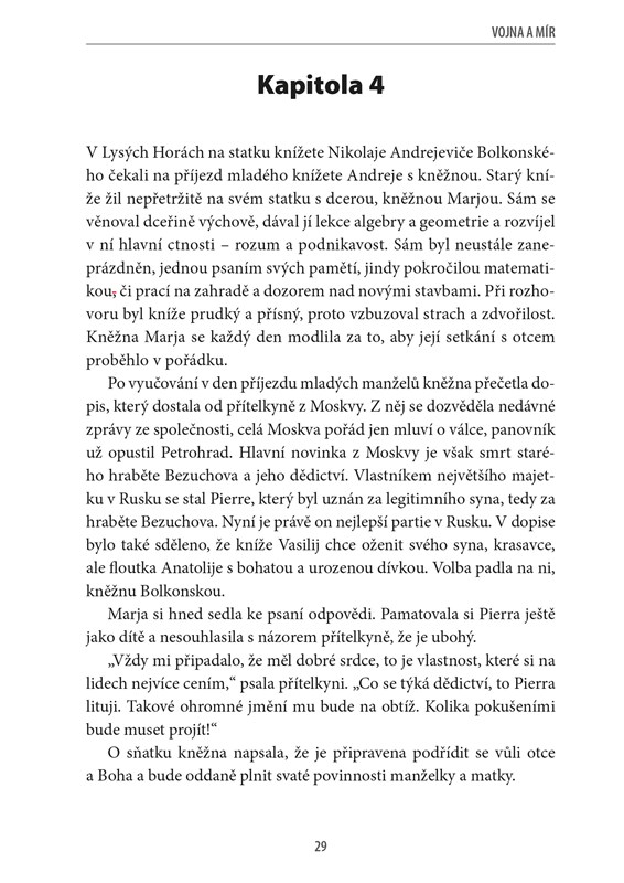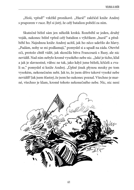 Román Vojna a mír se řadí mezi nejvýznamnější díla nejen ruské, ale i světové literatury. Popisuje Napoleonovo tažení do Ruska a obraz každodenního života v carském absolutismu z pohledu pěti aristokratických rodin. O milostná vzplanutí a líčení vojenských střetů není v díle nouze.