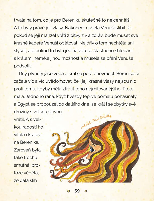 Podívali jste se někdy pořádně na noční oblohu plnou hvězd? Víte, že se na ní zrcadlí nepřeberné množství úžasných příběhů? Knížka, kterou držíte v ruce, vám představí ty nejznámější z nich. Seznámíte se s hrdiny starověkých bájí – s královnou Berenikou, s dvojčaty Castorem a Polluxem v souhvězdí Blíženců i s udatným hrdinou Herkulem. A nejen to, v knize najdete i pohádky, které v sobě snoubí celý vesmír a fantazii. Račte vstoupit do kouzelného světa hvězd, planet i komet…