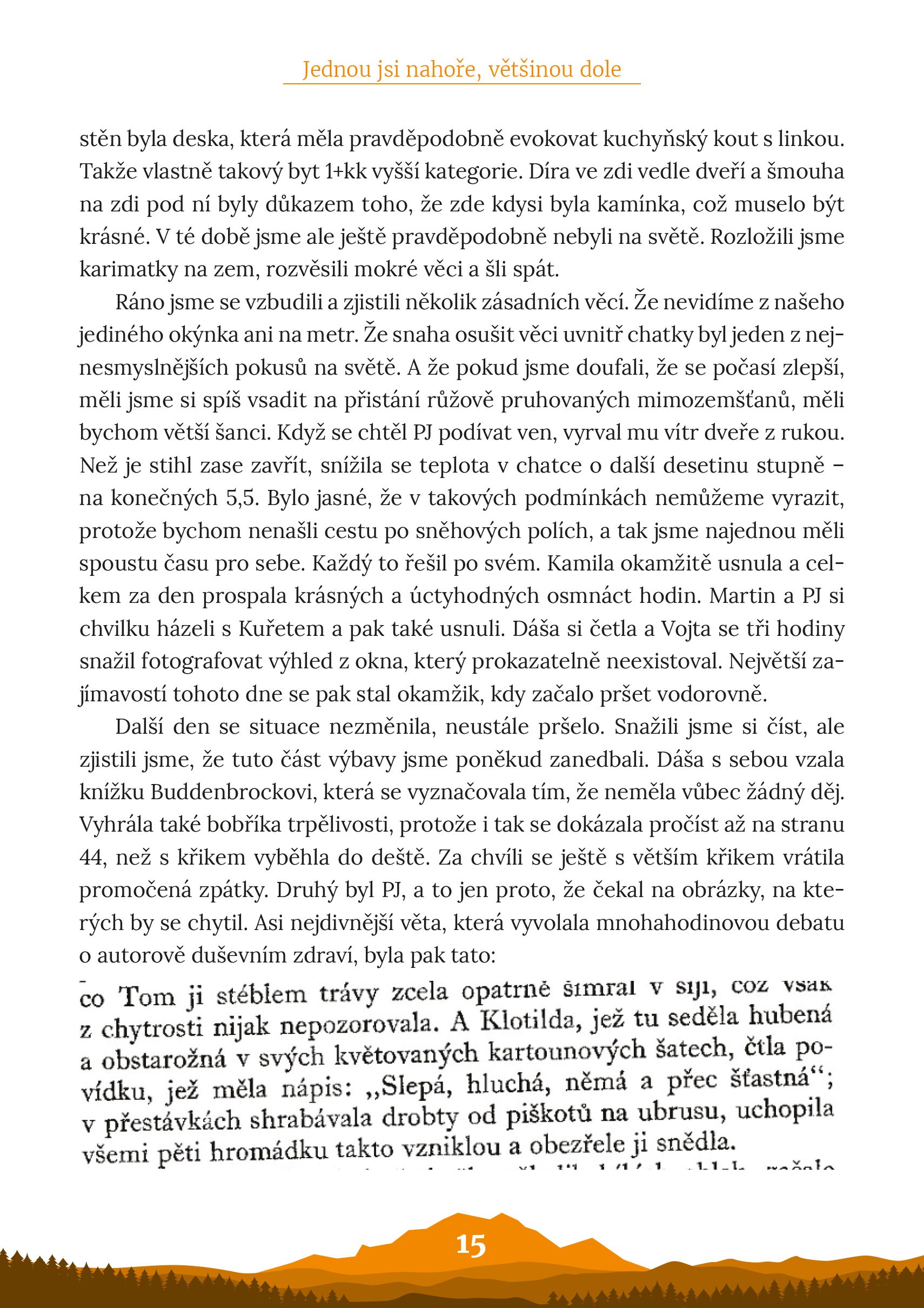 Když k Martinovi přišla nepálská sestřička, aby mu píchla morfium, pocítil obrovskou úlevu. S hrůzou si uvědomil, že tuto úlevu necítí díky tomu, že je to všechno za ním, ale z prostého faktu, že už ho konečně nebude léčit PJ, který si pod slovem hygiena představoval půl litru slivovice.