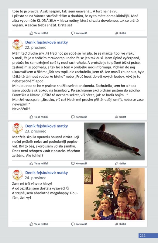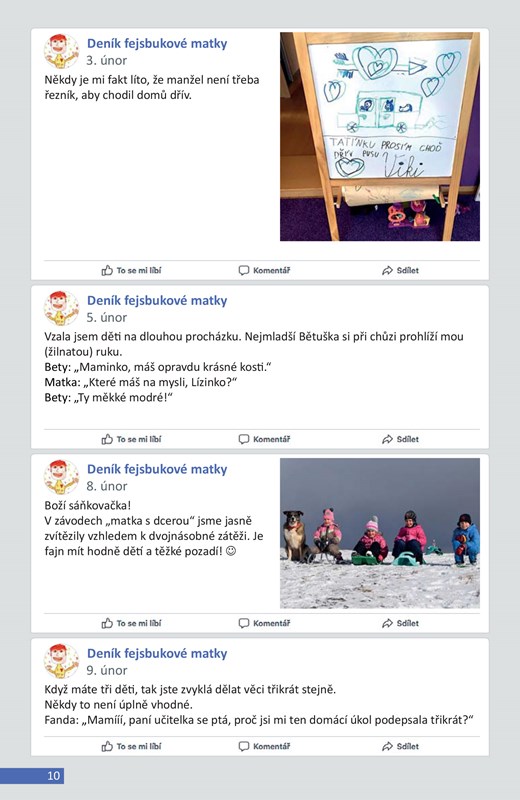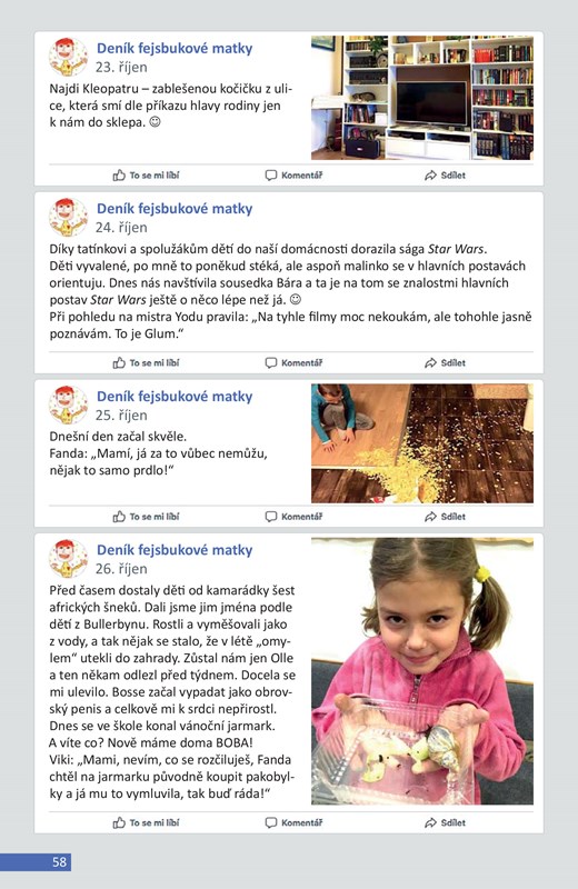 Deník fejsbukové matky (ne)končí má jediný cíl – udržet čtenáře rozesmátého od první po poslední stránku. S typickou sebeironií a vtipem přináší autorka v krátkých statusech příběhy ze života své obyčejně neobyčejné rodiny. Peripetie, které rodiče, dvojčata Viki a Fandu, jejich malou sestru Bětku (otcem nazývanou Bobánek) a domácí zvěřinec denně potkávají, tentokráte zahrnují statusy z let 2015–2017.